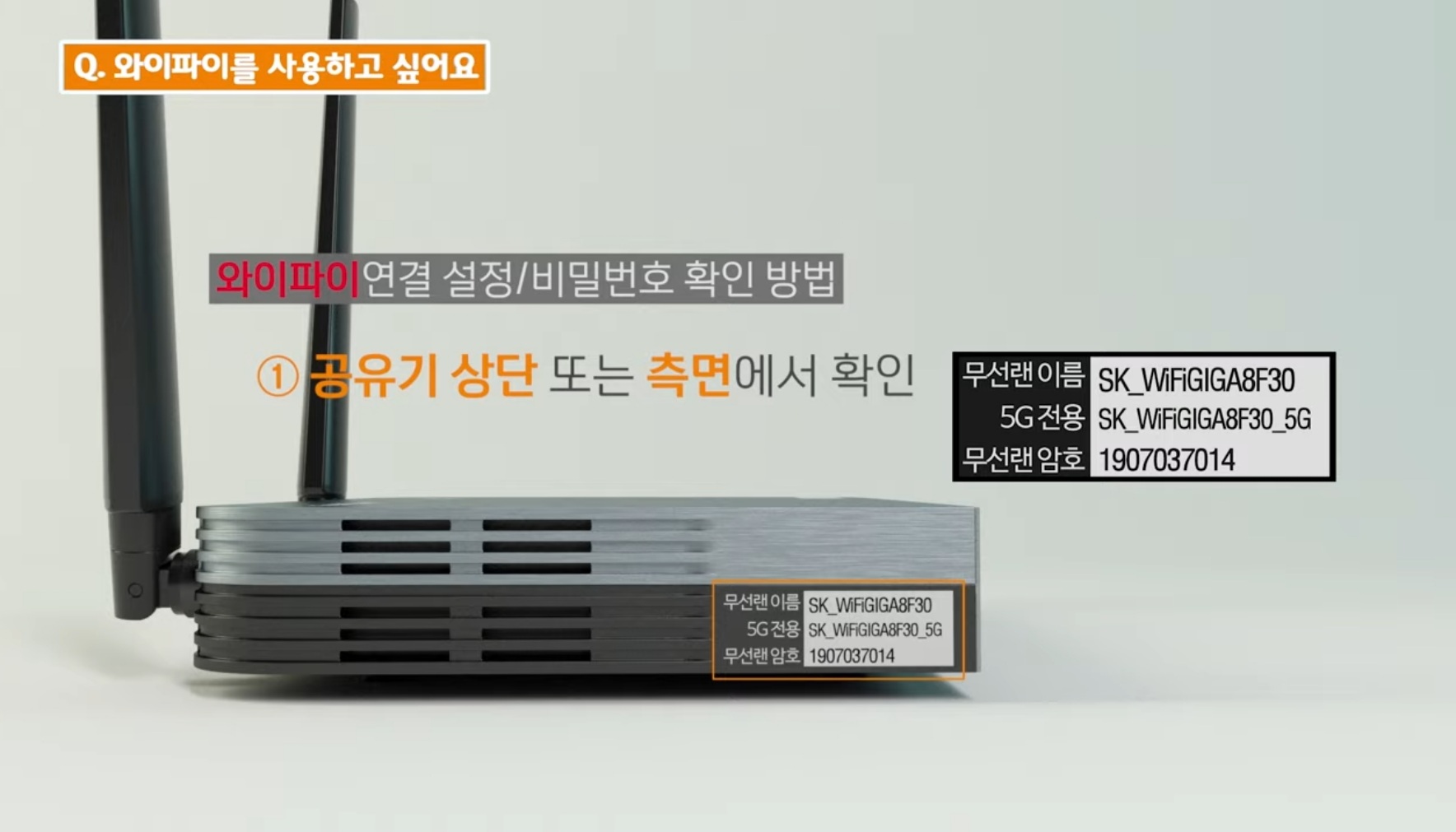 무선랜 이름과 암호는 와이파이 공유기 스티커를 통해 확인하실수 있습니다.