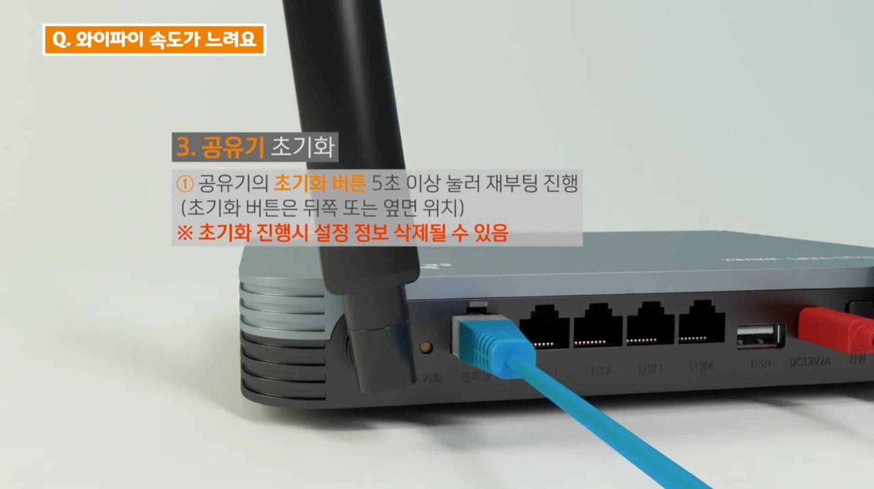 재 연결이 되면 공유기의 초기화 버튼을 눌러 초기화를 실행해 주세요.