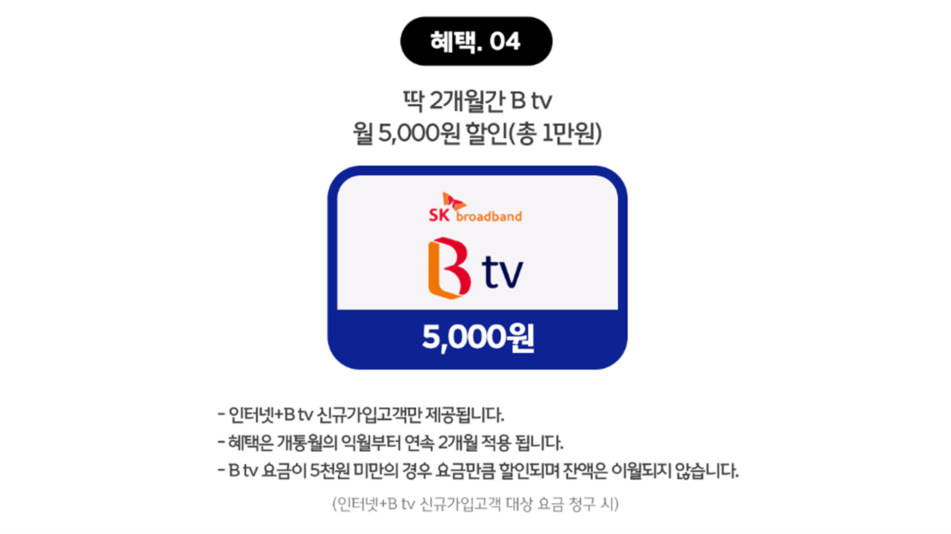 또한 SK 인터넷과 B tv 신규가입고객님을 위해 2개월간 B tv 요금이 5,000원 할인되는데요.