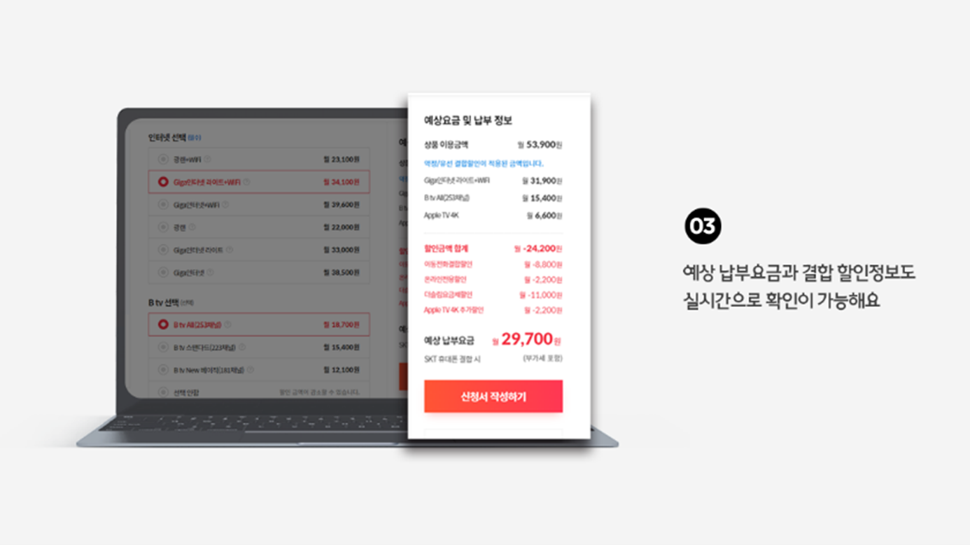 가입 페이지에서 원하는 인터넷, B tv, 셋톱박스, SKT 휴대폰 결합 할인을 선택해주세요.