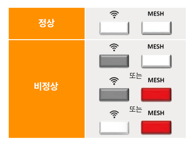 확장기의 LED 상태가 위와 같을 때, 메인 무선공유기의 전원케이블 재연결(재부팅, 60초 소요)해주세요.
