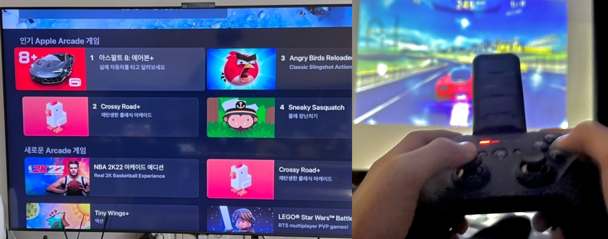 아이폰/아이패드/맥북 미러링이 쉽게 되고 반응속도도 상당히 빨라서 모바일 게임을 플레이할 수 있을 정도라 마음에 들어요. Apple TV 앱 자체적으로도 아케이드 게임 서비스가 되어서 심심할 때 큰 화면으로 게임하기는 좋습니다. 게임을 좋아한다면 Xbox나 플스 컨트롤러 혹은 MFi 인증 컨트롤러를 구입해서 즐기시면 좋을 거예요. ^^