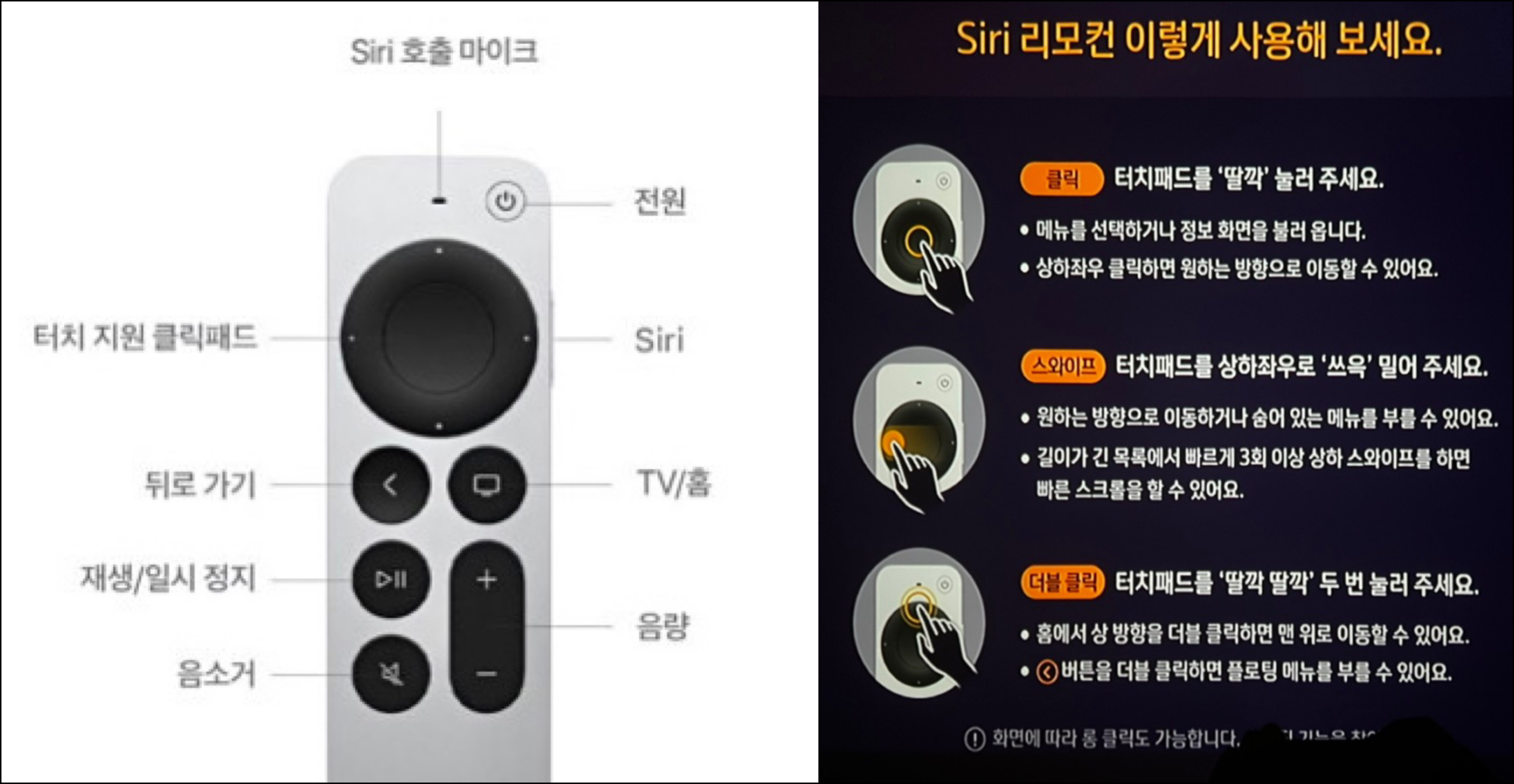 Apple TV 4K Siri 리모컨 사용법은 약간의 학습이 필요합니다. B tv 앱 [My - 이용안내 - Siri 리모컨]에서도 보실 수 있어요.