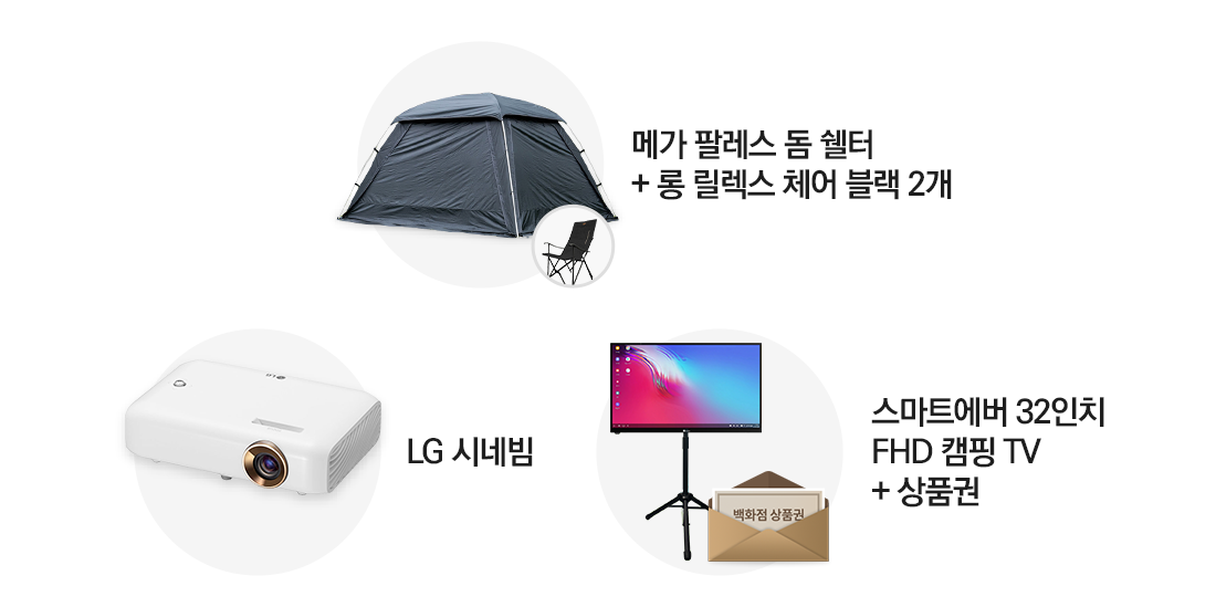 여러 종류의 텐트와 빔프로젝터, 캠핑 TV 등의 사은품 중에서 고를 수 있는데요.