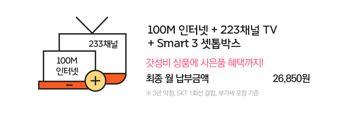3년 약정으로 SKT 1회선 결합하시면 부가세 포함 월 26,850원에 실속 있는 인터넷과 TV 상품을 사용하실 수 있어요.