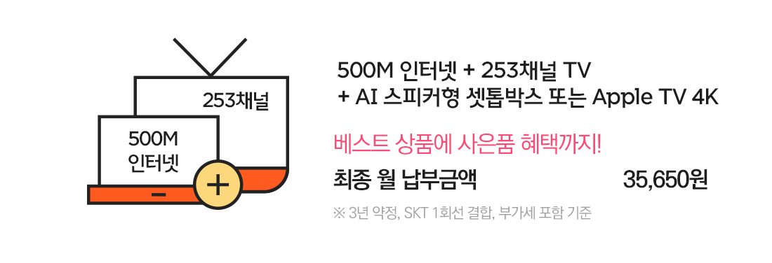 3년 약정으로 SKT 1회선 결합하시면 부가세 포함 월 35,650원에 SK브로드밴드의 베스트 상품을 이용하실 수 있어요!