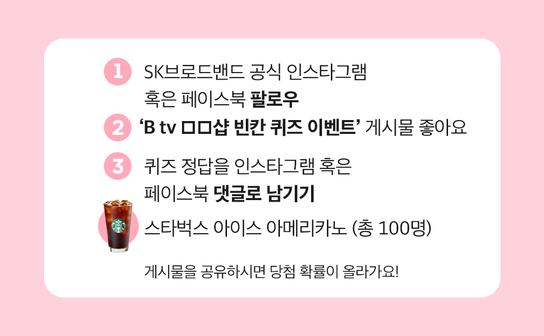 SK브로드밴드 공식 인스타그램과 페이스북에서는 <B tv □□샵> 빈칸 퀴즈 이벤트가 진행 중입니다.