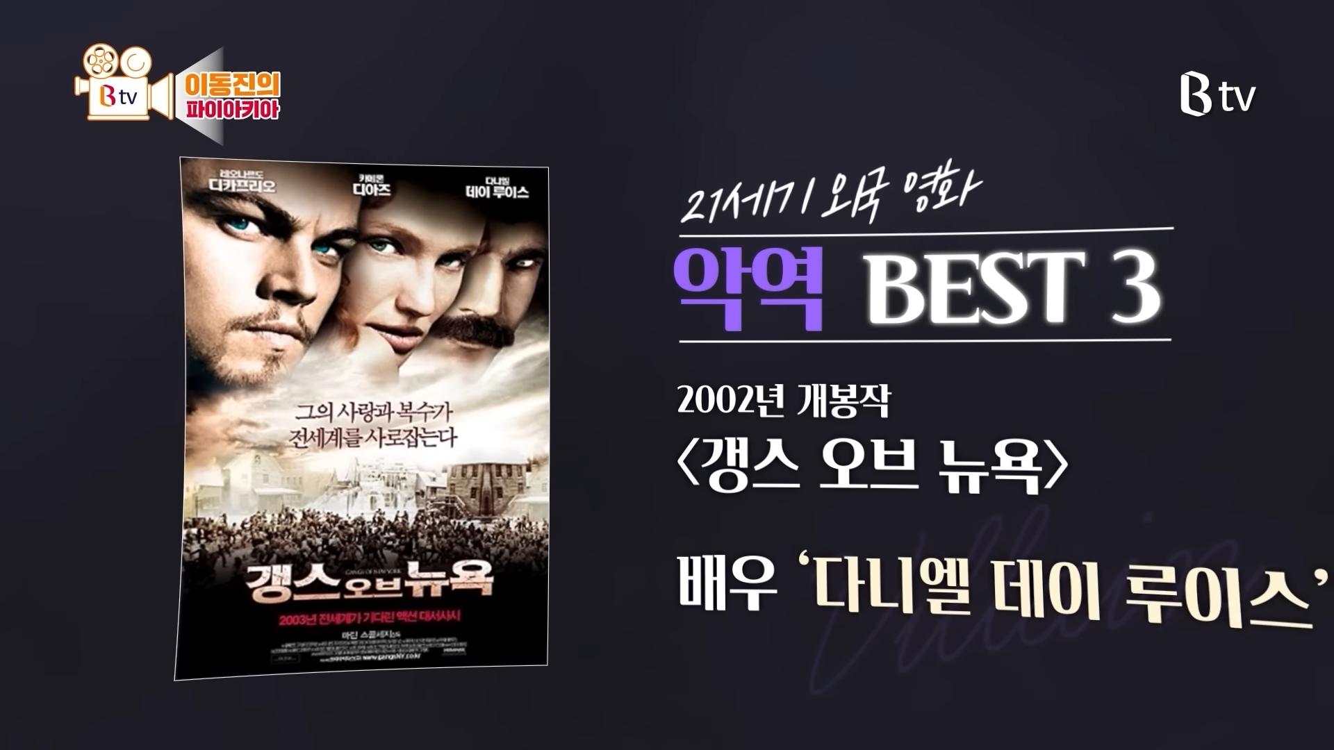 이동진 평론가는 <갱스 오브 뉴욕>에서 ‘다니엘 데이 루이스’가 보여준 악역 연기를 3위로 선정했습니다.