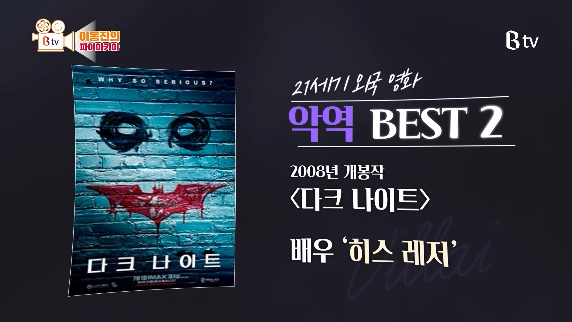 ‘히스 레저’의 2위를 많은 분이 예상을 못 하셨을 수도 있다고 이동진 평론가는 말했는데요.