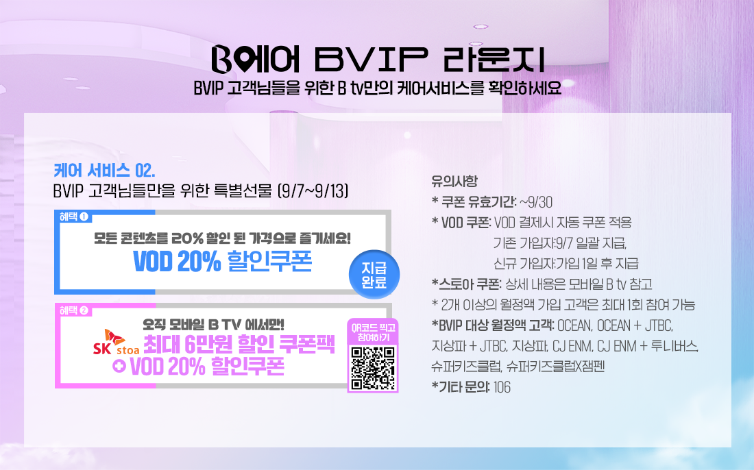 BVIP 대상 고객님께는 특별 혜택으로 VOD 할인 쿠폰과 SK 스토아 최대 6만 원 할인 쿠폰팩도 제공됩니다.