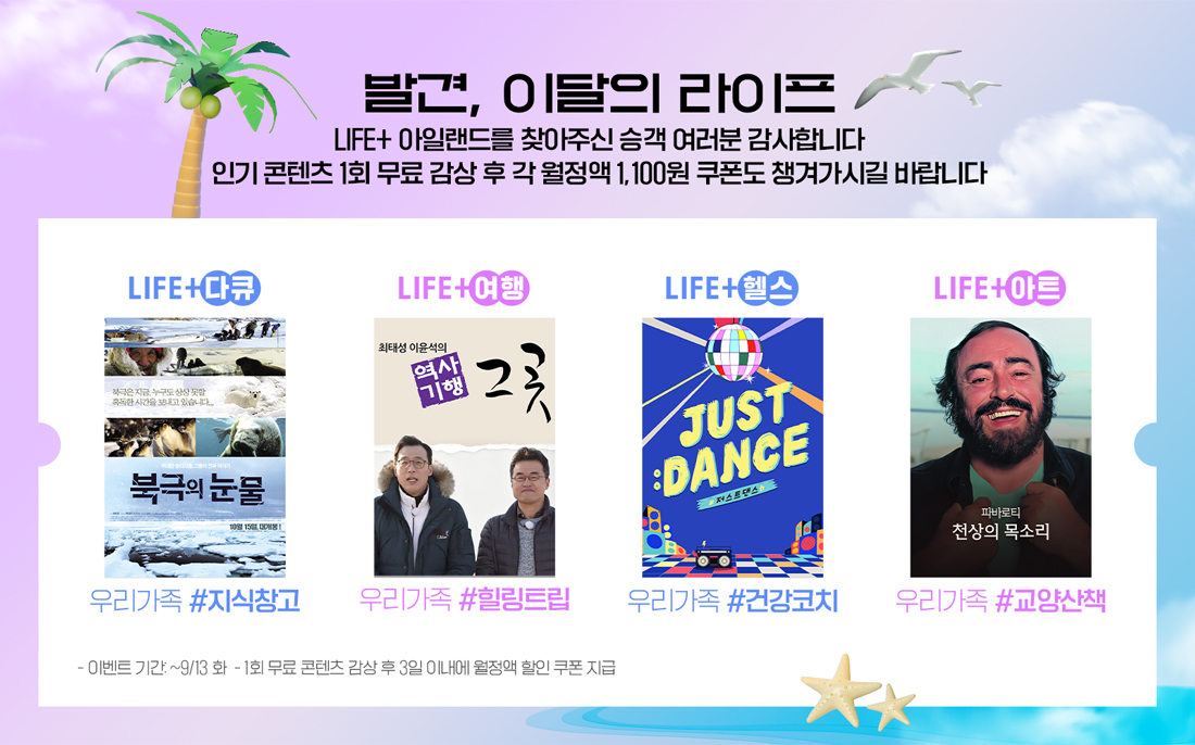 LIFE+ 고객님을 위한 1회 무료 및 월정액 1,100원 할인 쿠폰도 꼭 챙겨가세요.