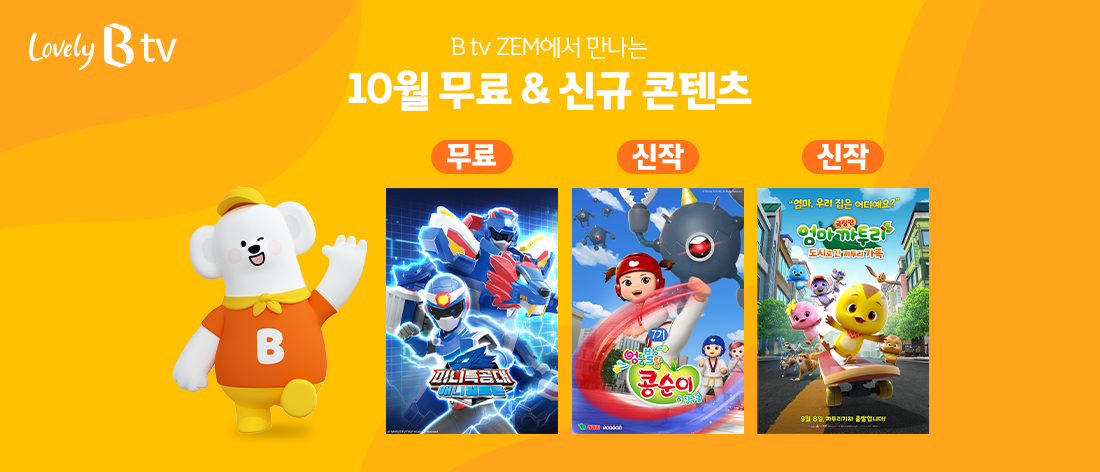 B tv ZEM 10월의 무료 & 신규 콘텐츠 안내 (미니특공대 애니멀트론, 엉뚱발랄 콩순이와 친구들 시즌7, 극장판 엄마 까투리: 도시로 간 까투리 가족)