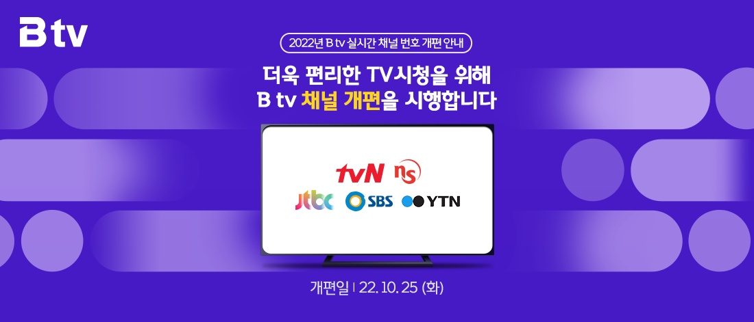 B tv가 더욱 편리한 TV 시청을 위해 2022년 10월 25일, 실시간 채널 번호를 개편합니다.