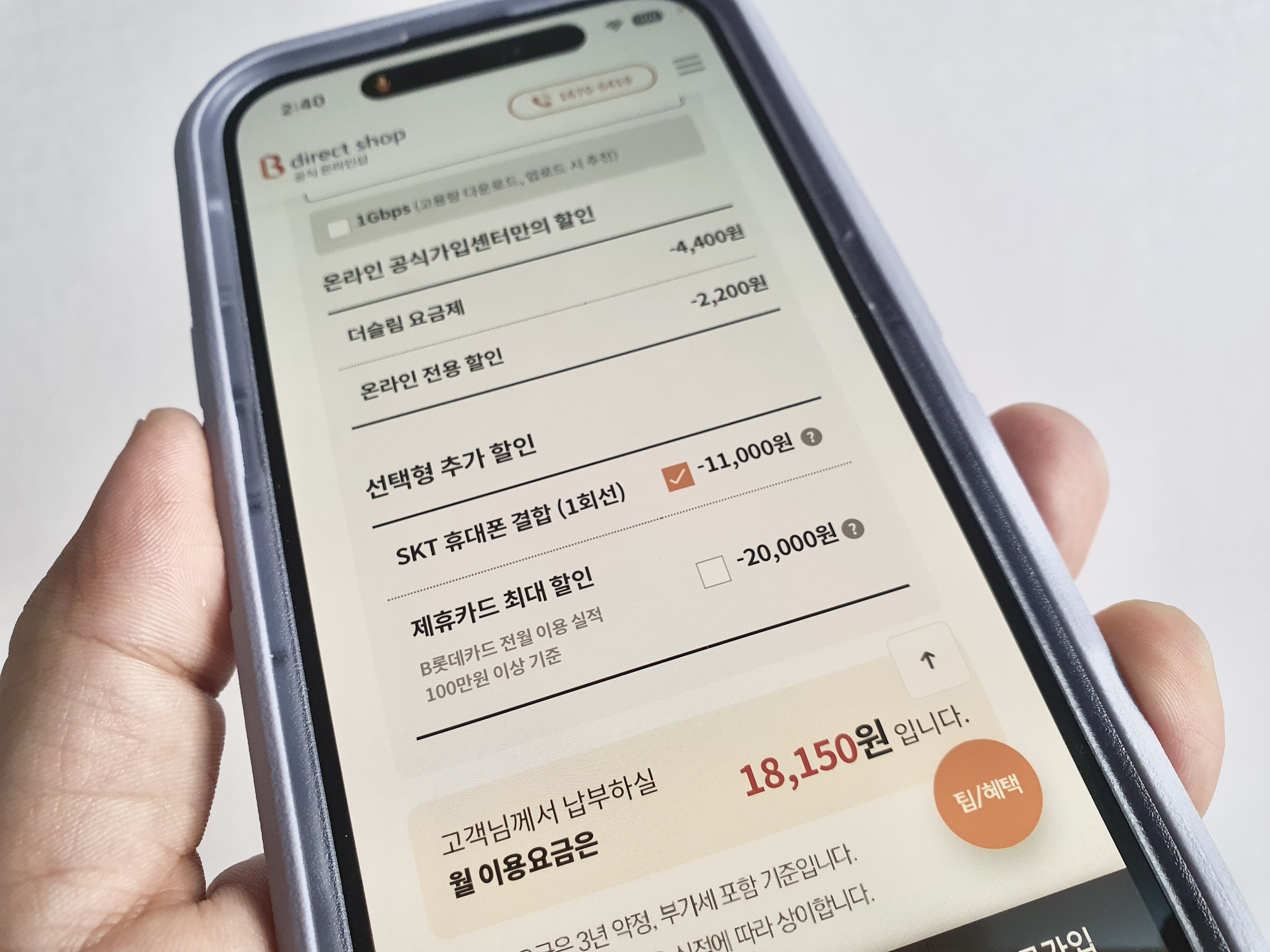 SKT 휴대폰 결합이 가능하다면 할인금액(-11,000원)이 크게 높아져 월 인터넷 요금이 18,150원 밖에 안됩니다. 광랜인터넷 요금과 겨우 1,650원 밖에 비용 차이가 안 나죠? ㅎㅎ