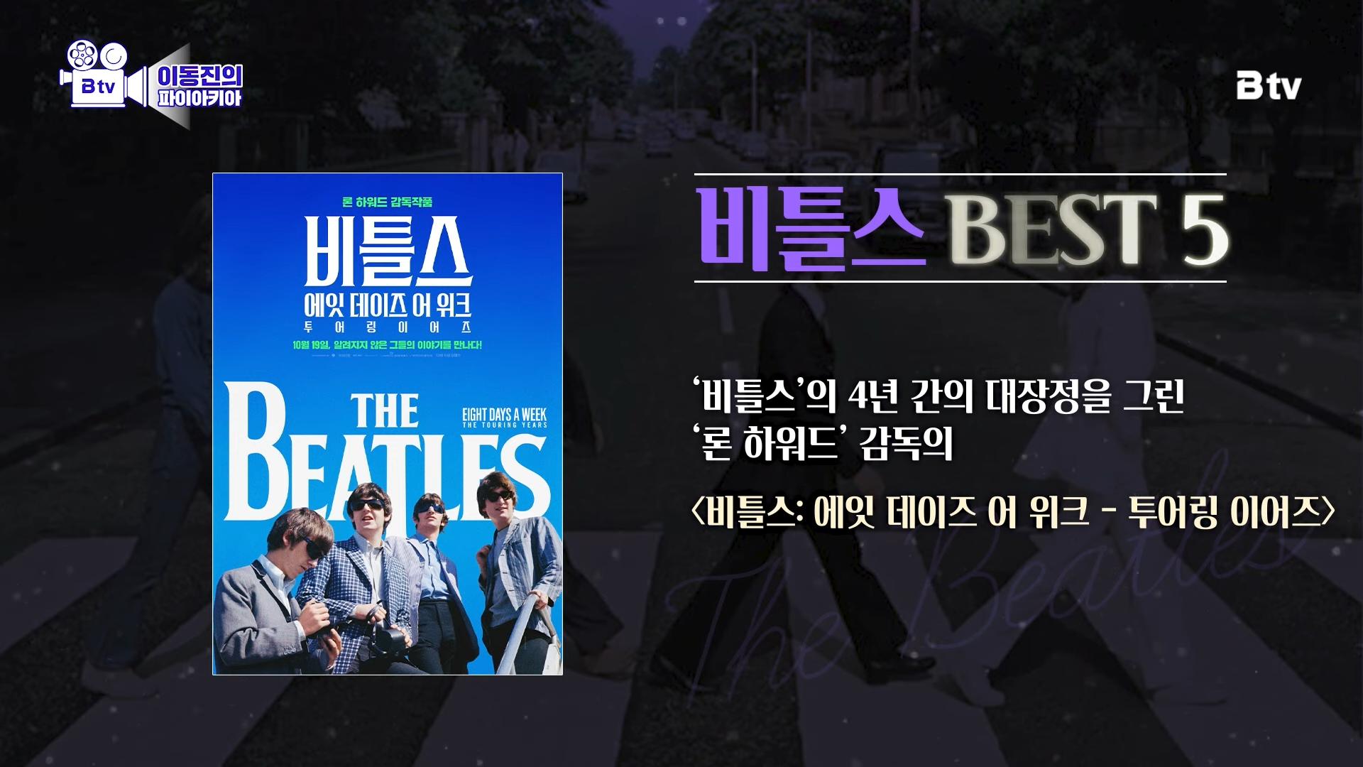 다음은 ‘론 하워드’ 감독의 다큐멘터리 <비틀스: 에잇 데이즈 어 위크 – 투어링 이어즈> 입니다.