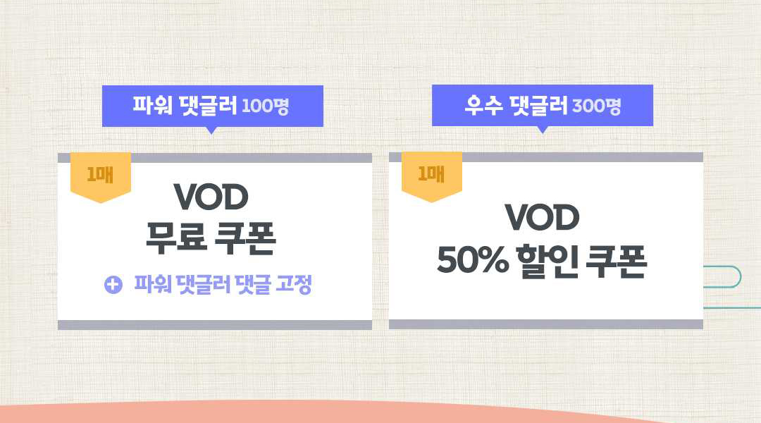 파워 댓글러 100분께는 VOD 무료 쿠폰을, 우수 댓글러 300분께는 VOD 할인 쿠폰을 드려요!