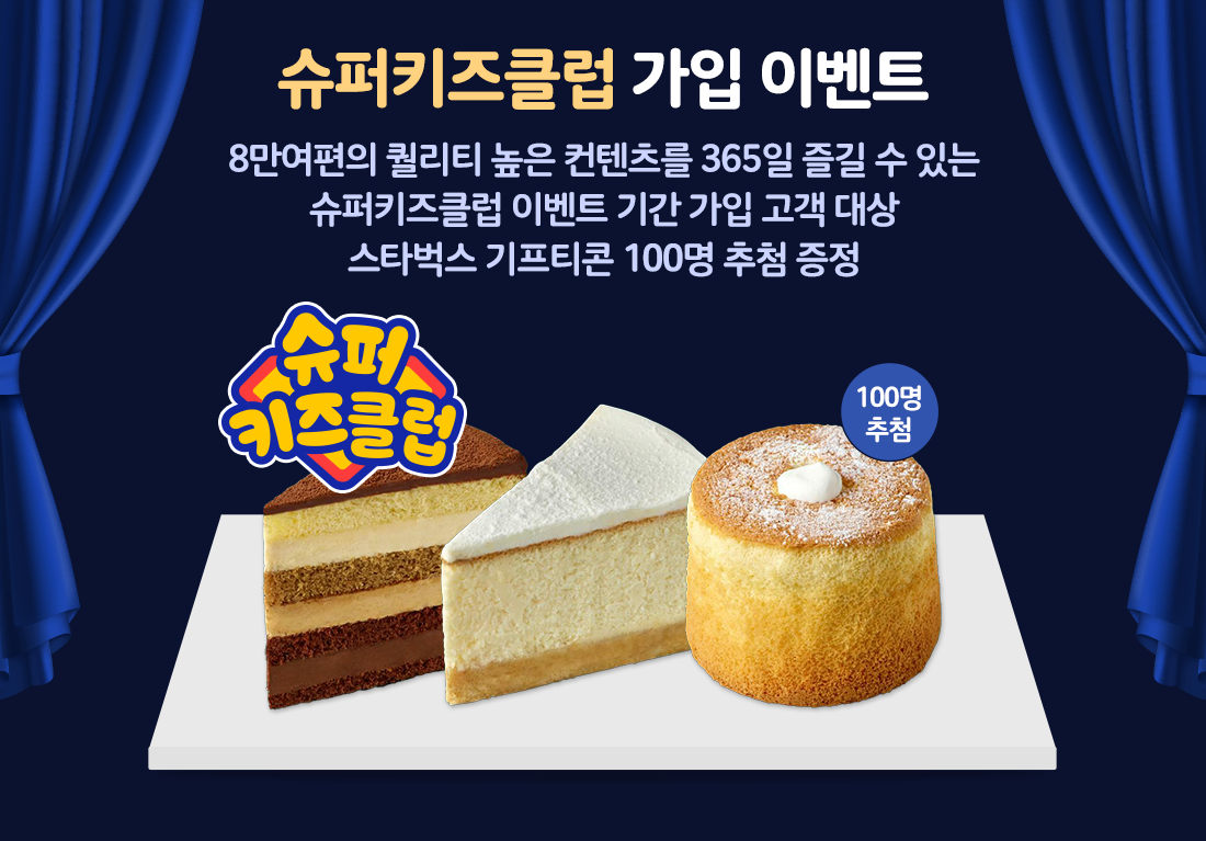 5월 5일에서 18일까지 슈퍼키즈클럽 월정액 가입 고객님 중 100분을 추첨하여