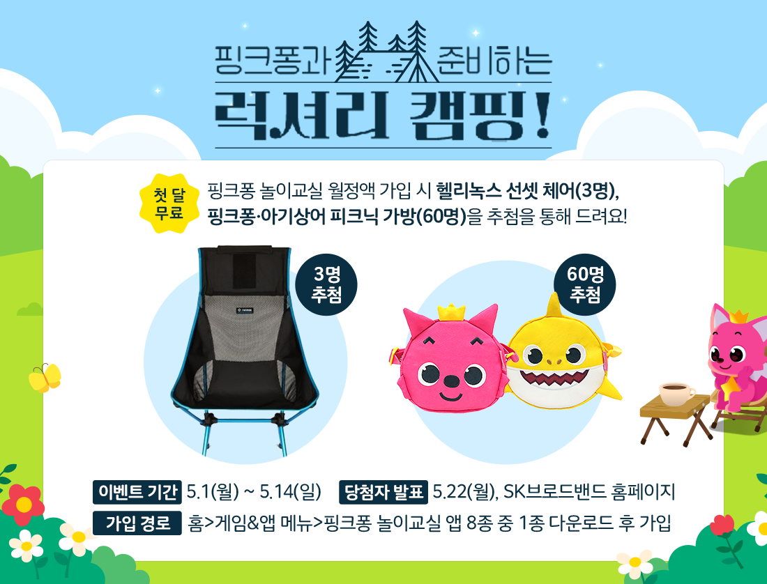 5월 1일에서 14일까지 핑크퐁 놀이교실 월정액에 가입하시면, 추첨을 통해 캠핑 아이템을 드려요!