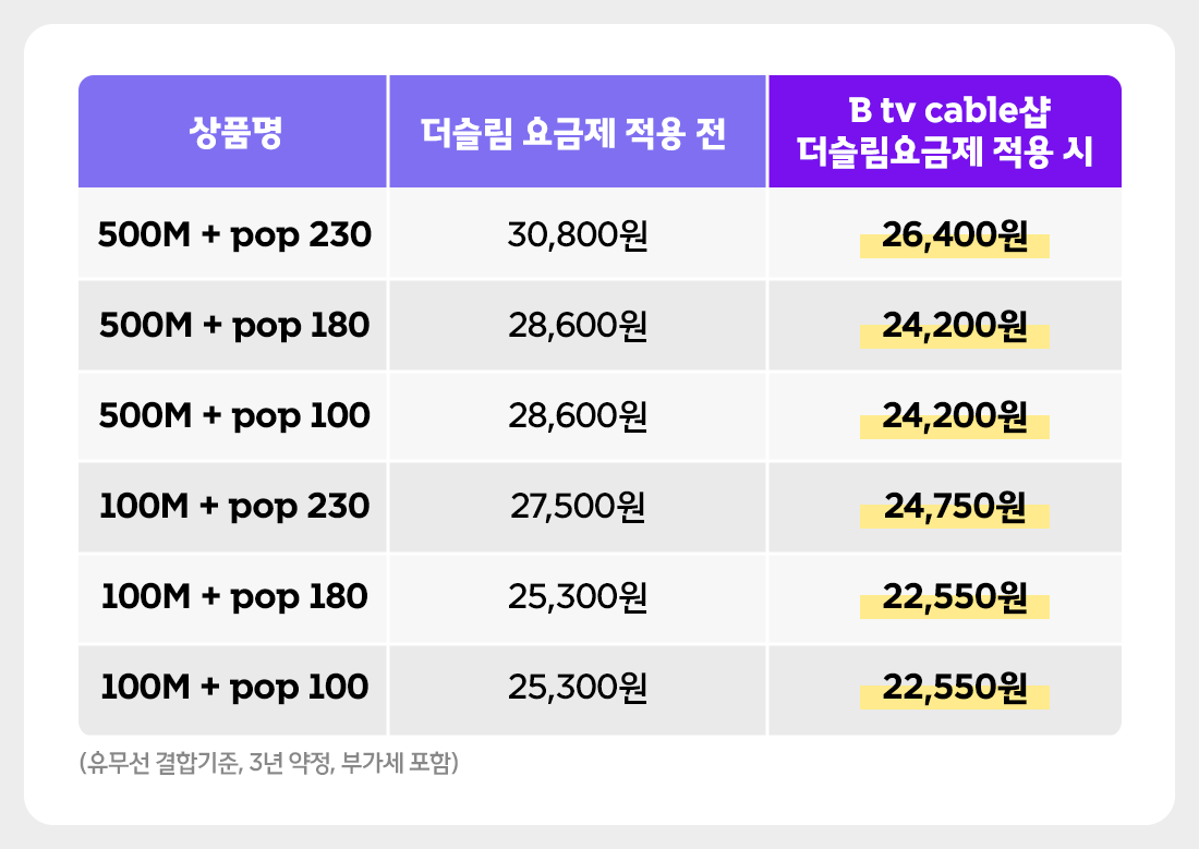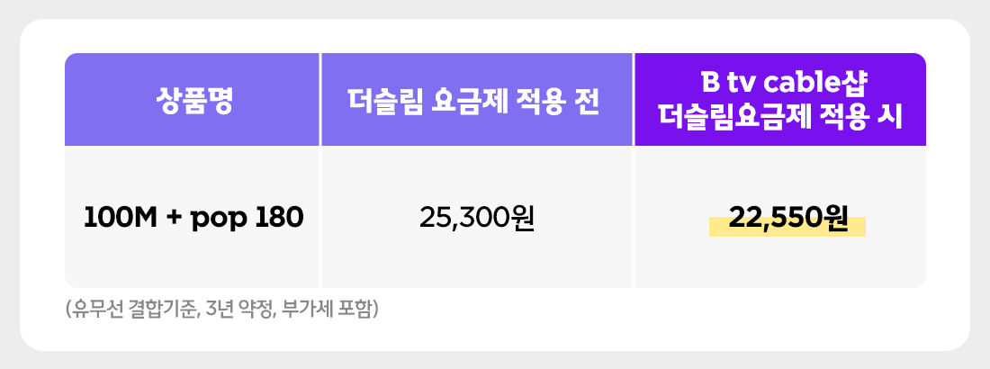 B tv cable샵에서 온라인 전용 할인 더슬림 요금제를 적용하셔서 월 26,400원 갓성비 요금으로,