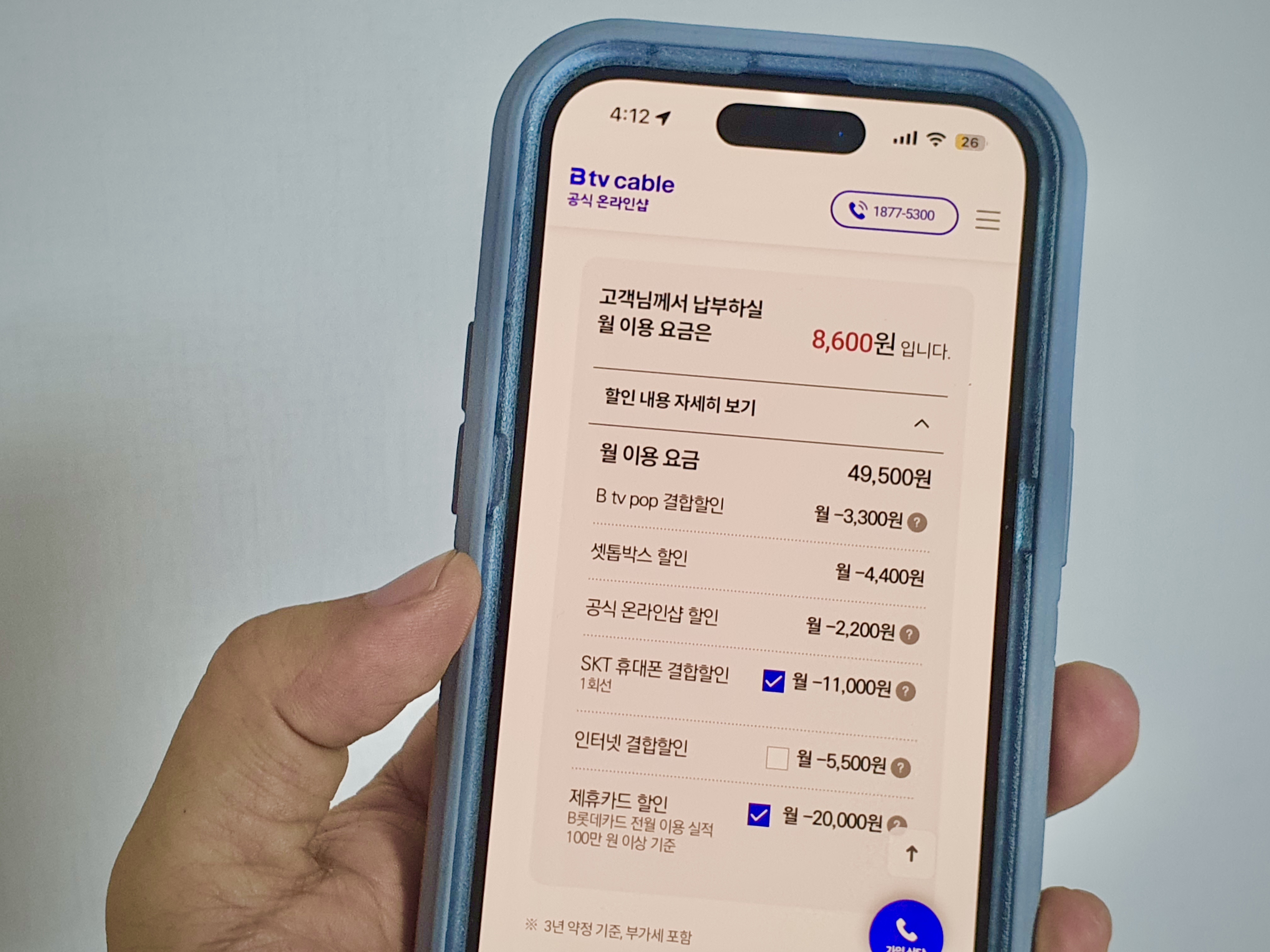 예를 들어 기가라이트 인터넷(500Mbps) 3년 약정할 때 B tv pop, SKT 휴대폰(1) 결합할인, 셋톱박스 대여료 할인에 제휴카드 할인, 공식 온라인샵 할인 등이 더해지면 위 상품들로 구성하더라도 요금이 원래 49,500원에서 최대 월 8,600까지 낮아질 수 있는 거죠.