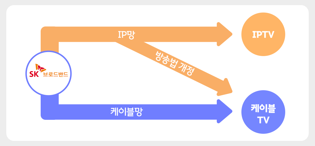 케이블 TV는 동축 케이블, IPTV는 IP 망(인터넷라인)만을 사용해야 했지만, 방송법 개정으로 IP 망으로도 케이블 TV 서비스가 가능해졌다
