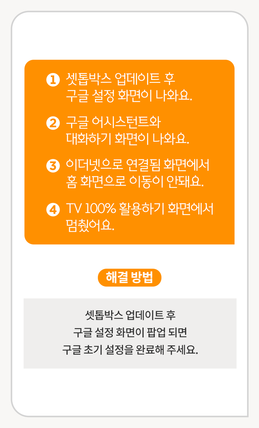 햬결 방법 : 셋톱박스 업데이트 후 구글 설정 화면이 팝업 되면 구글 초기 설정을 완료해 주세요.