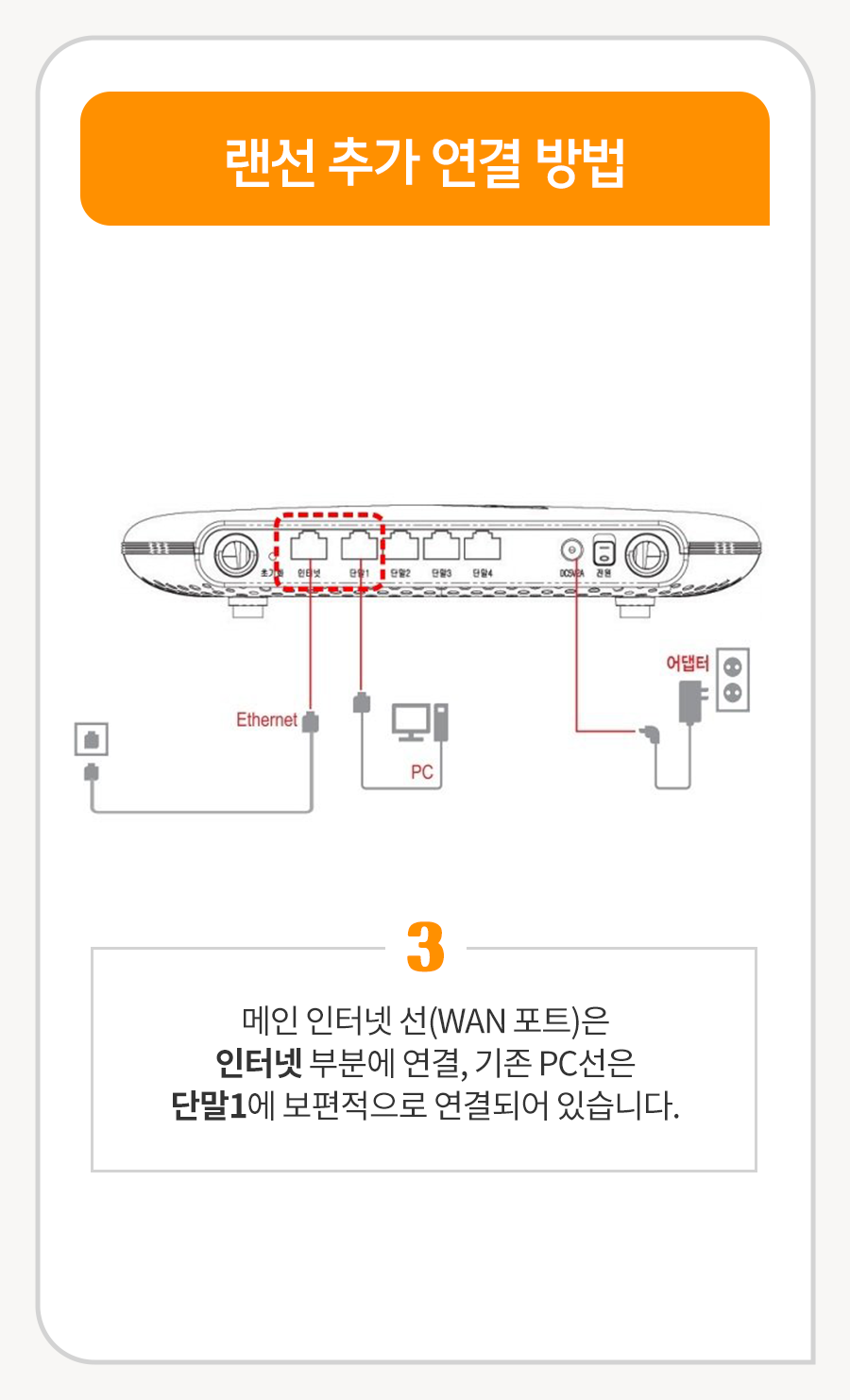 3) 메인 인터넷 선(WAN 포트)은 인터넷 부분에 연결, 기존 PC선은 단말1에 보편적으로 연결되어 있습니다.