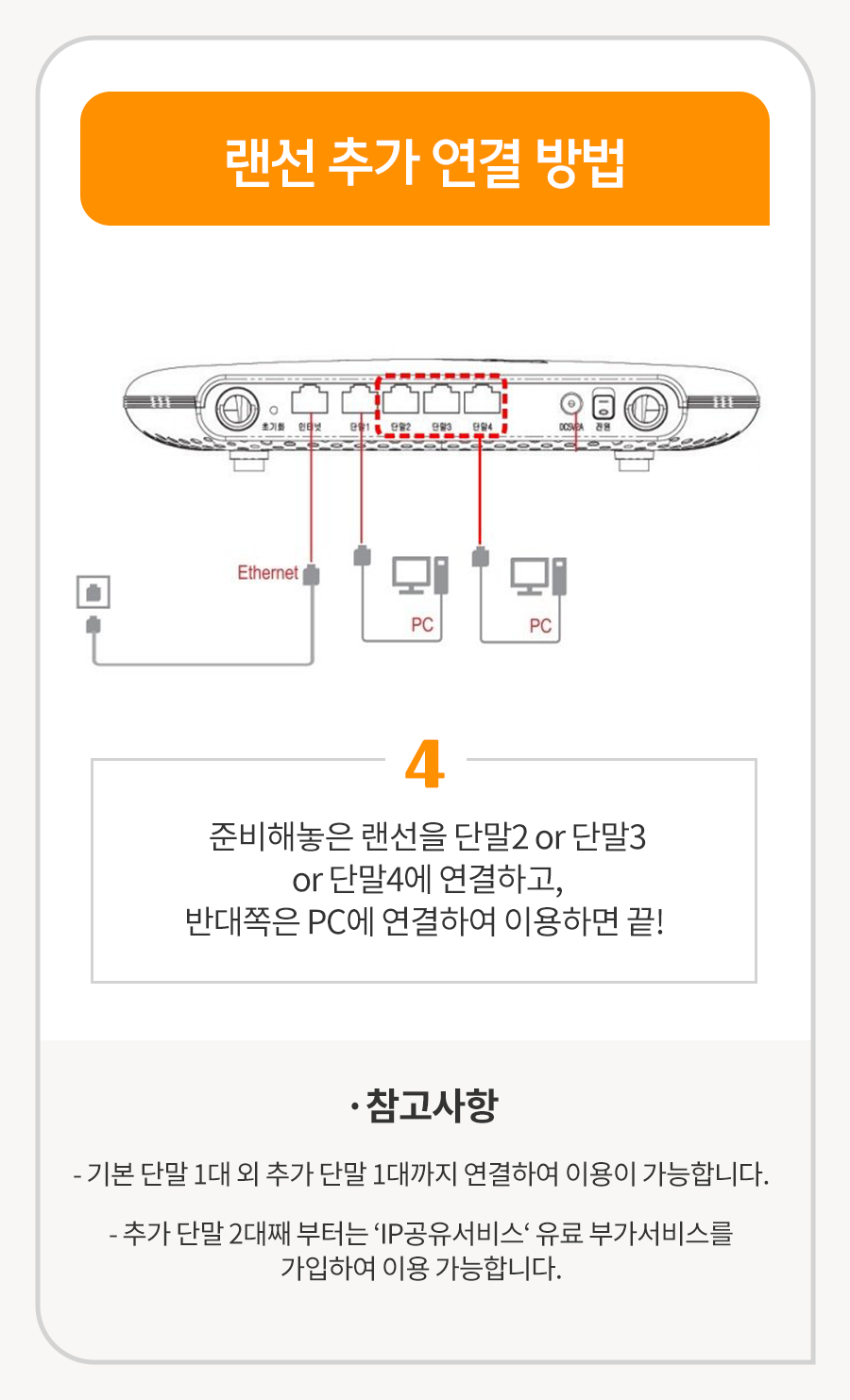 - 추가 단말 2대째 부터는 'IP공유서비스' 유료 부가서비스를 가입하여 이용 가능합니다.
