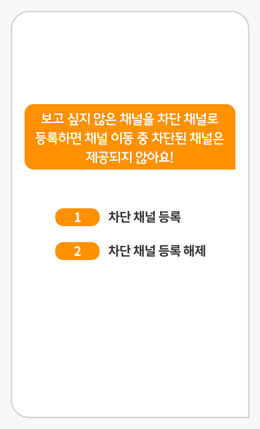 보고 싶지 않은 채널을 차단 채널로 등록하면 채널 이동 중 차단된 채널은 제공되지 않아요!