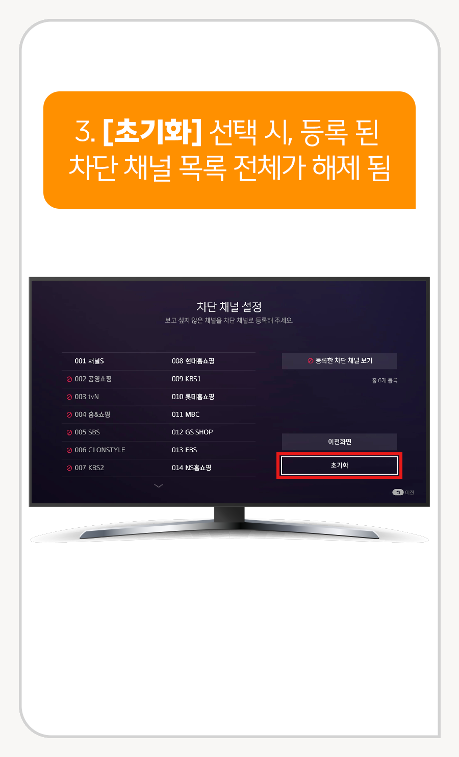 3. [초기화] 선택 시, 등록된 차단 채널 목록 전체가 해제됨