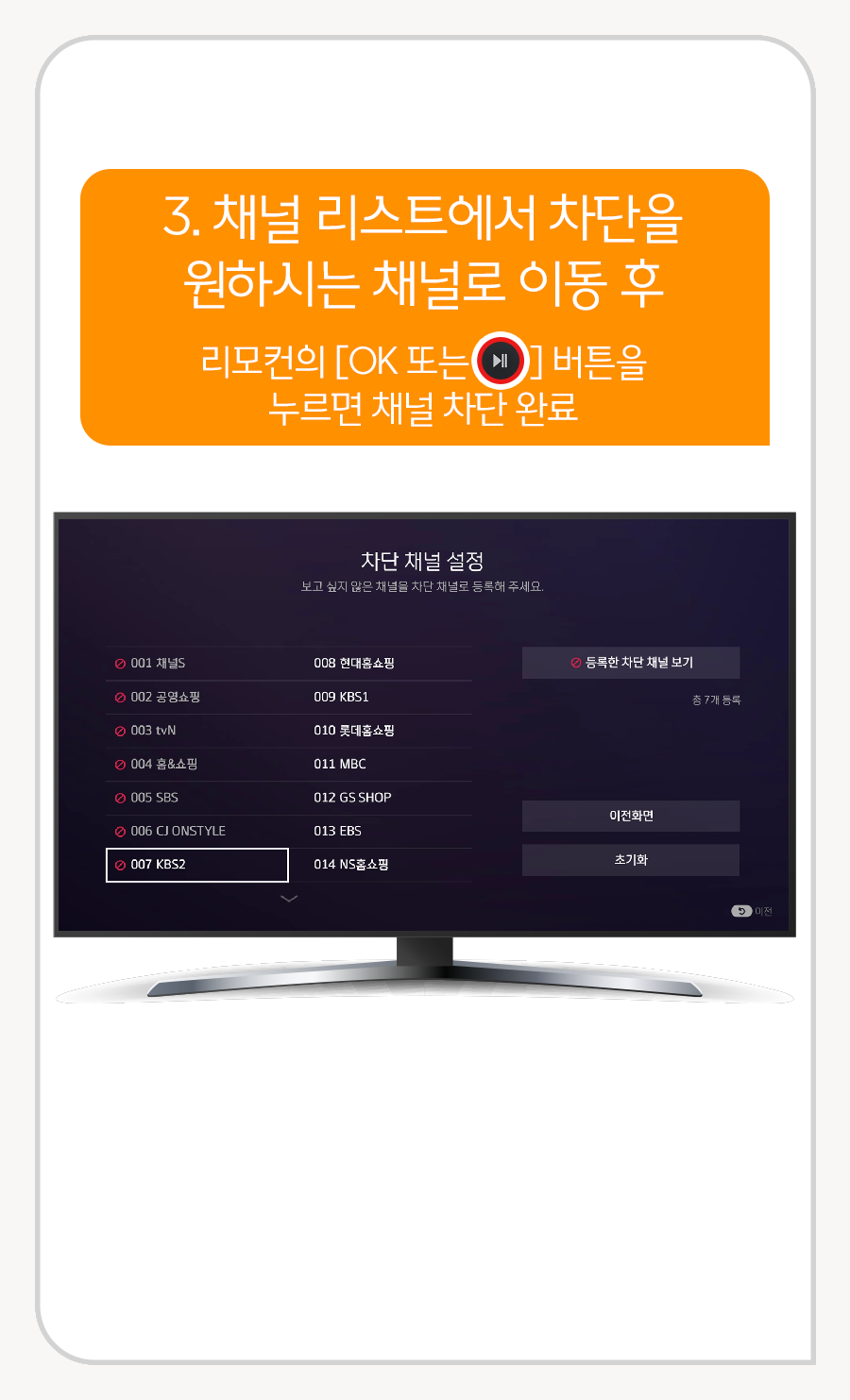 3. 채널 리스트에서 차단을 원하시는 채널로 이동 후 리모컨의 [OK 또는▶||]버튼을 누르면 채널 차단 완료