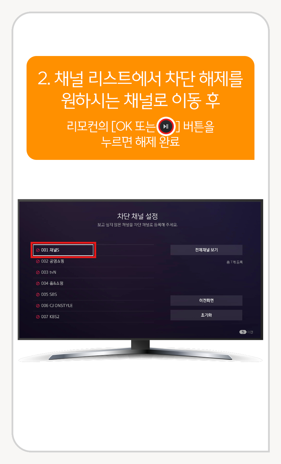 2. 채널 리스트에서 차단 해제를 원하시는 채널로 이동 후 리모컨의 [OK 또는]버튼을 누르면 해제 완료