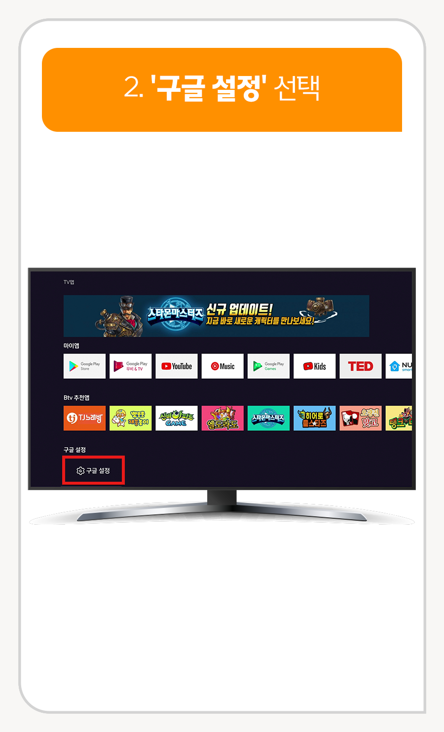 B tv 홈 ▶ 앱 ▶ 구글 설정 ▶ 앱 ▶ 모든 앱 보기시스템 앱 보기 ▶ Chromecast built-in 데이터 삭제 ▶ 셋톱박스 전원스위치 껐다가 켜기