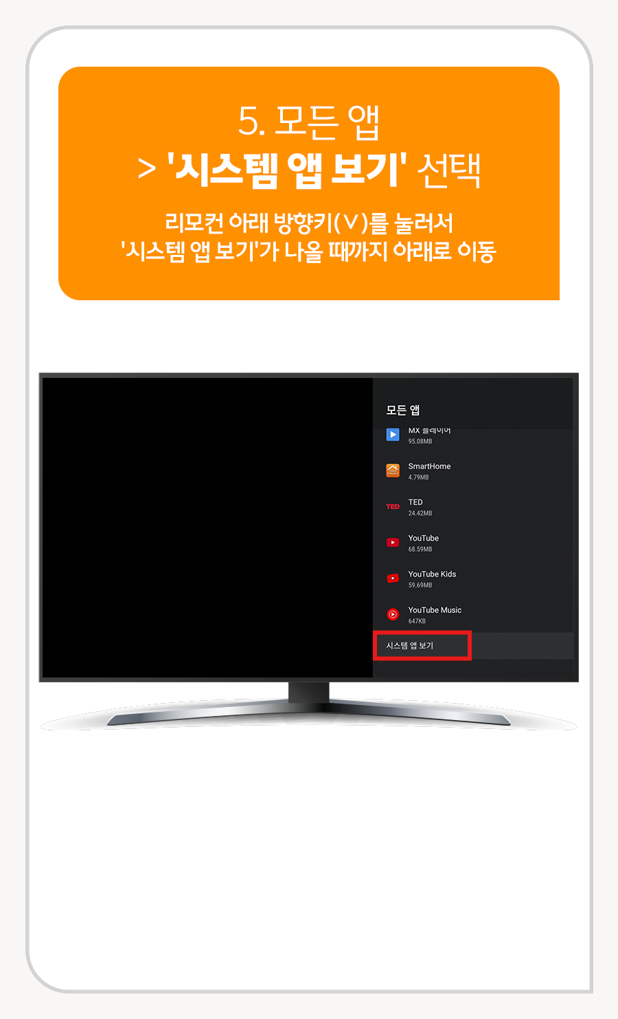 리모컨 아래방향키(V)를 눌러서 '시스템 앱보기'가 나올 때까지 아래로 이동