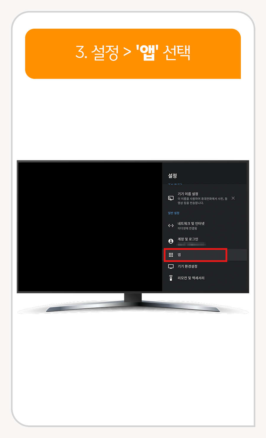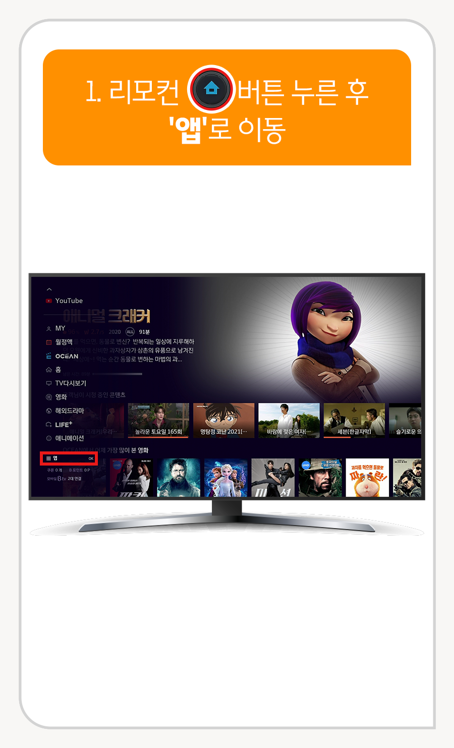 1. 리모컨 홈 버튼 누른 후 '앱'으로 이동