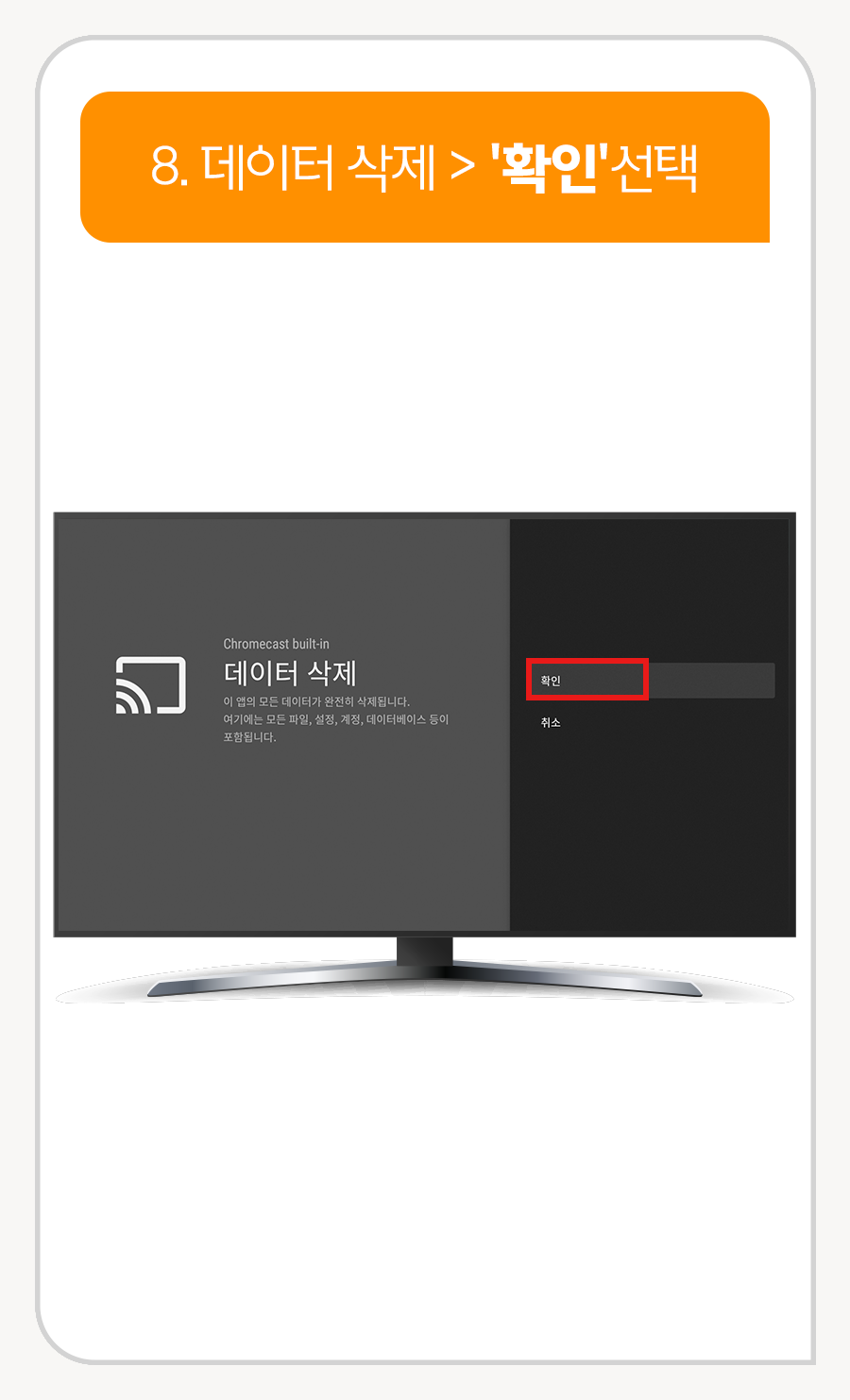 Chromecast built-in앱 데이터 삭제 완료 후 반드시 전원을 껐다가 다시 켜주세요.