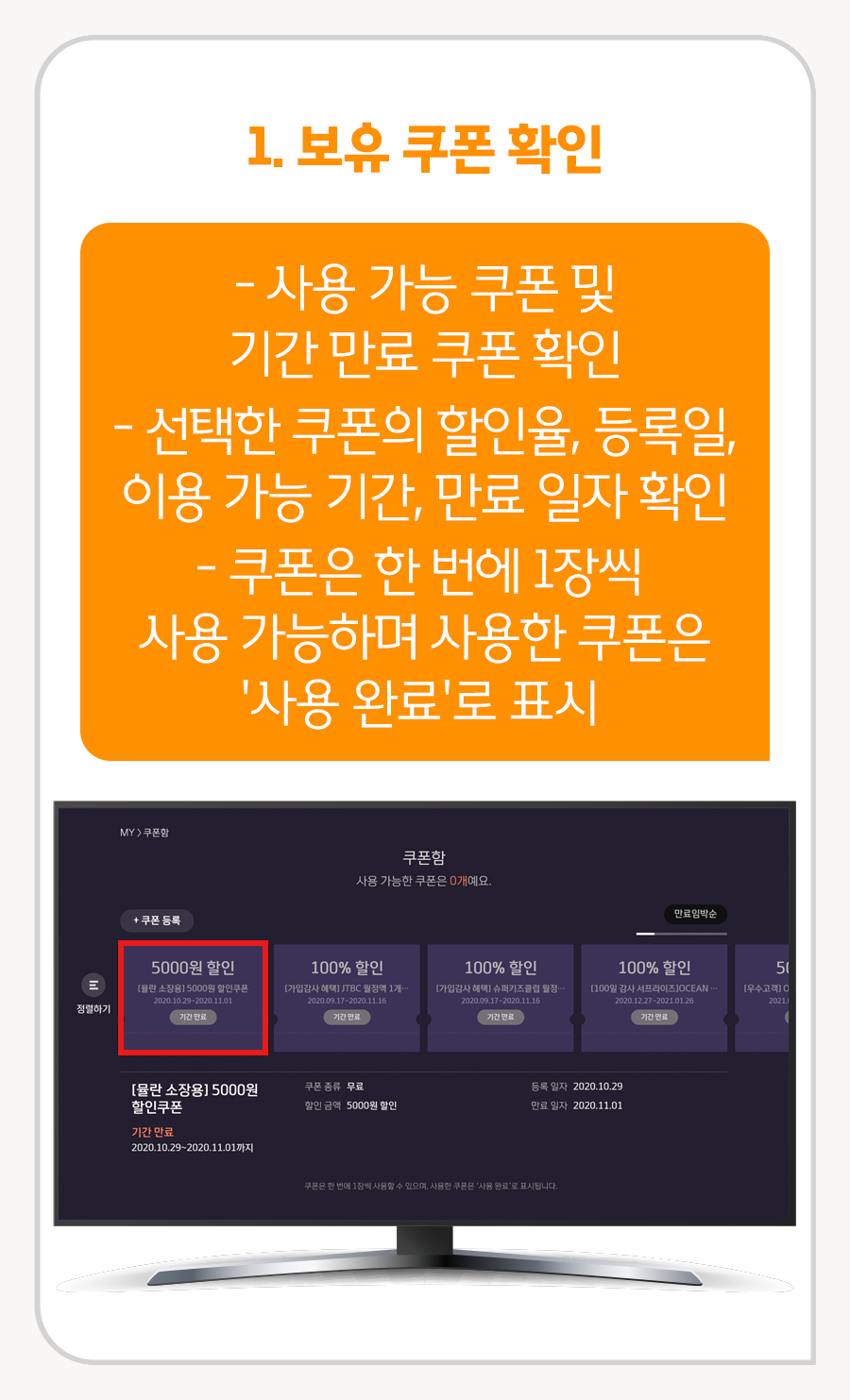 - 선택한 쿠폰의 할인율, 등록일, 이용 가능 기간, 만료 일자 확인