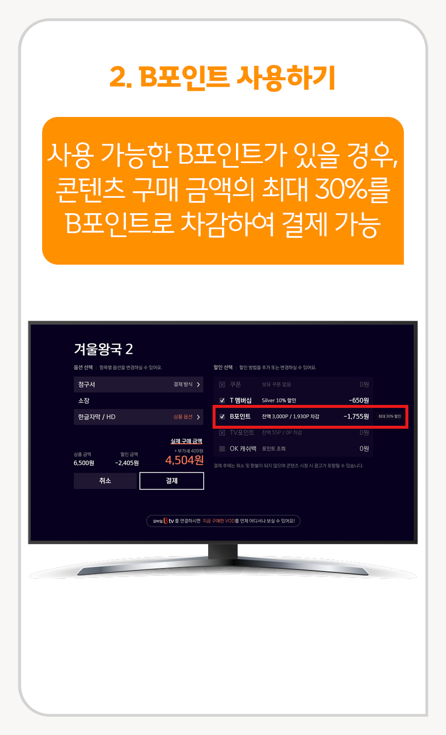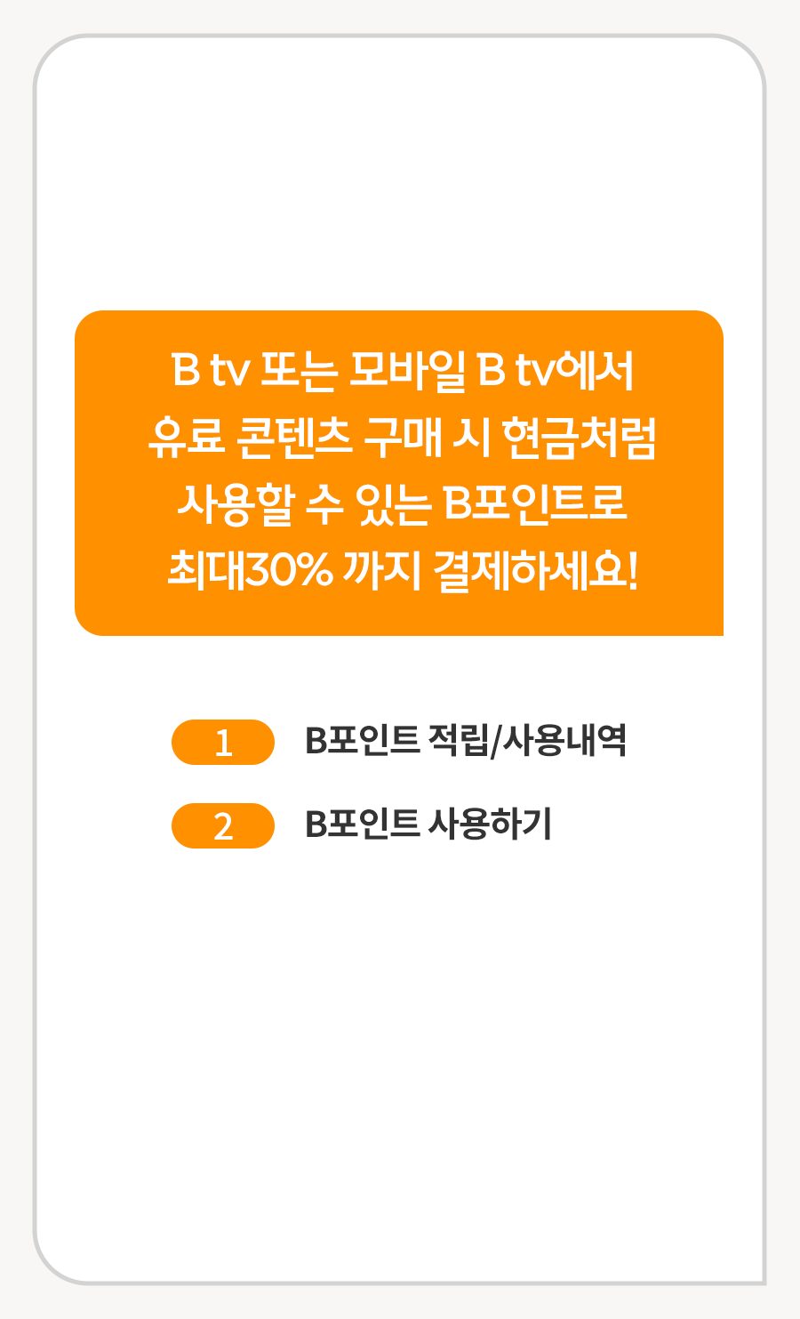 B tv 또는 모바일 B tv 에서 현금처럼 사용할 수 있는 사이버머니인 B포인트로 유료 콘텐츠 구매 시 최대 30%까지 결제하세요!