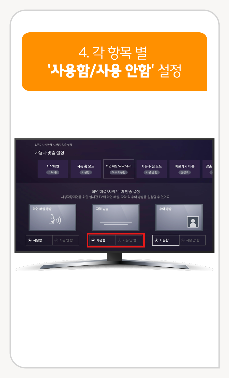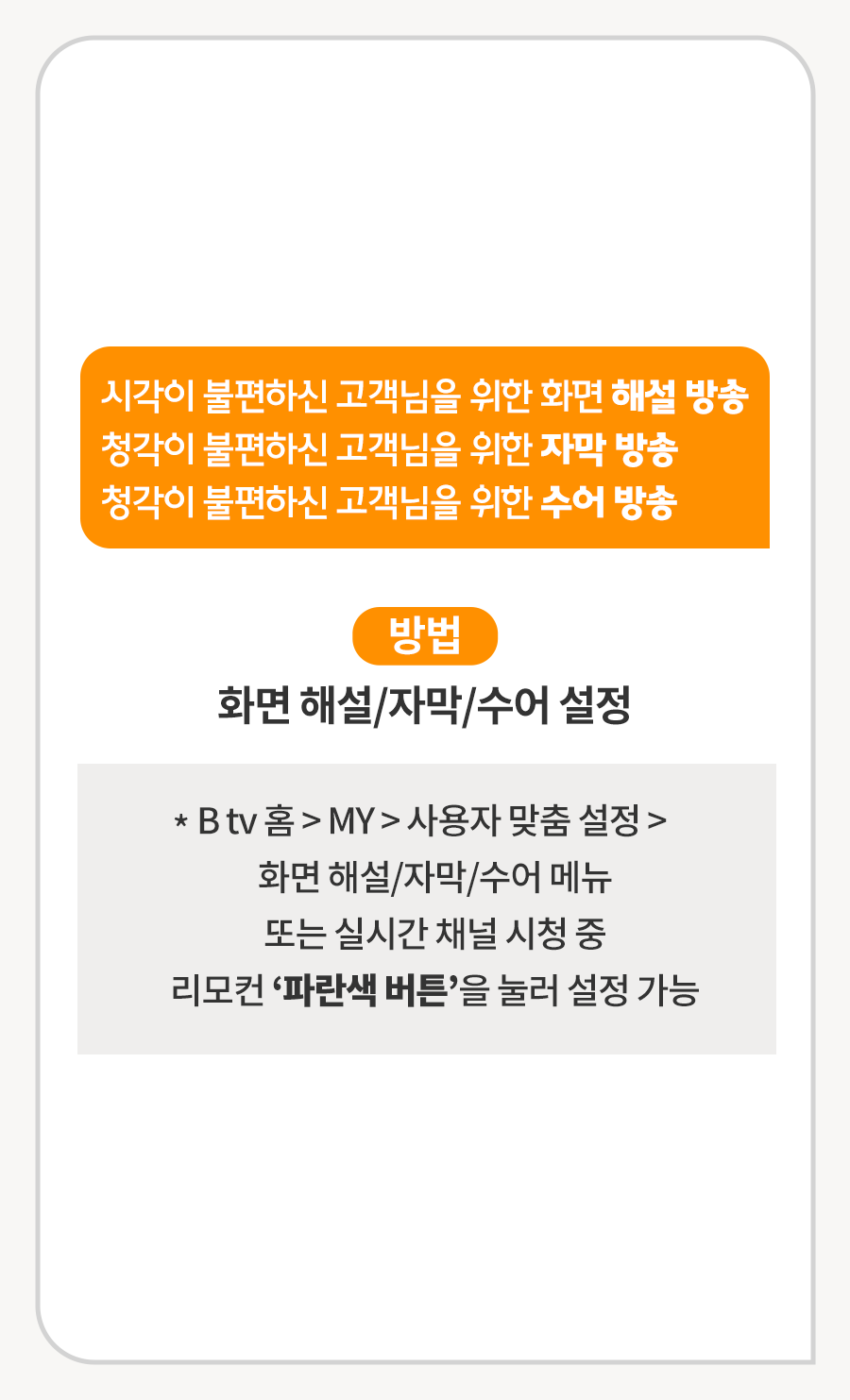 * B tv 홈 > MY > 사용자 맞춤 설정 > 화면 해설/자막/수어 메뉴