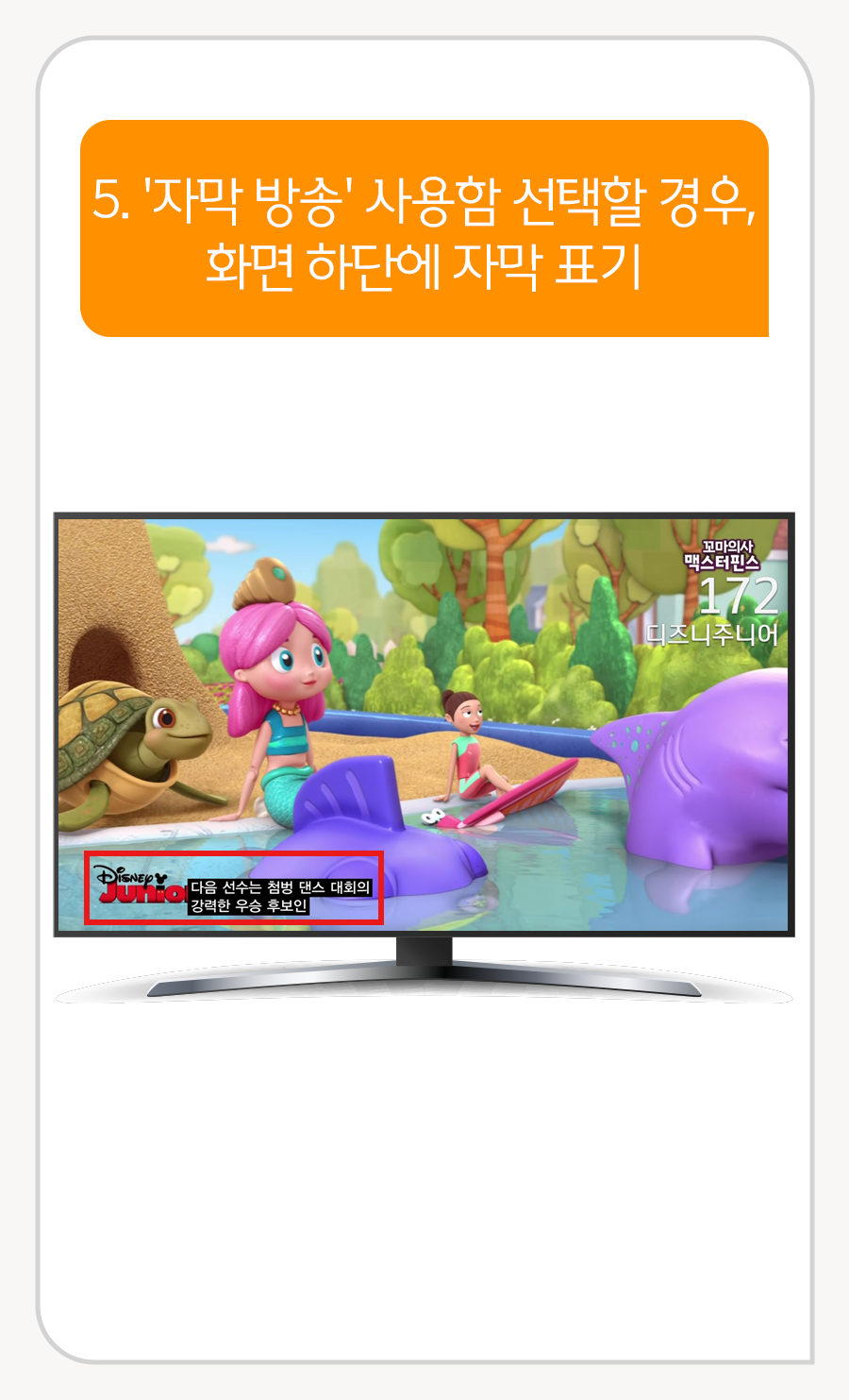 5. '자막 방송' 사용함 선택할 경우, 화면 하단에 자막 표기