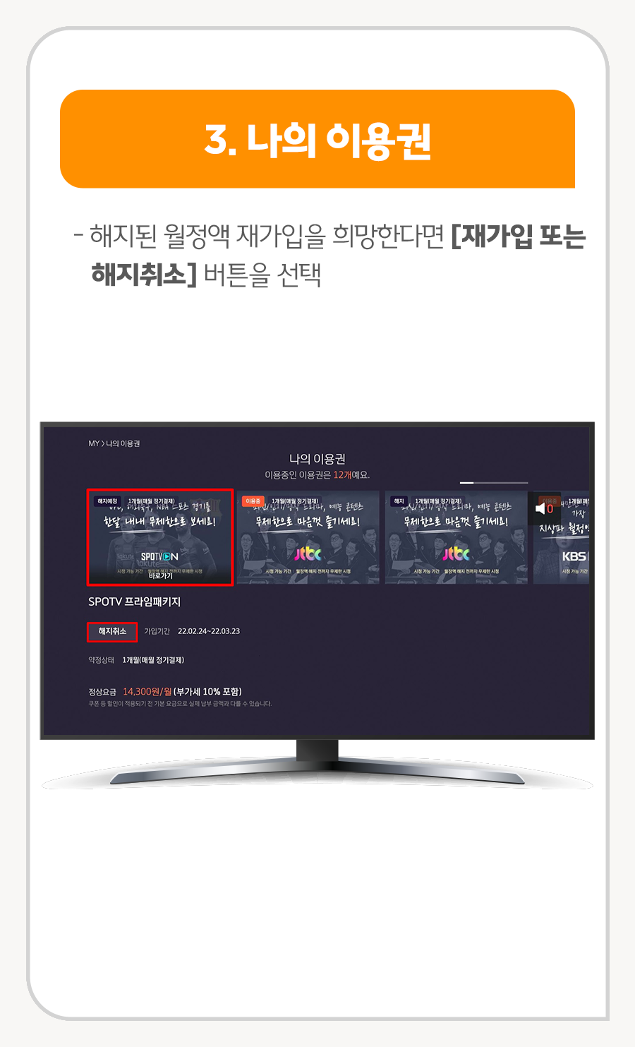 - 해지된 월정액 재가입을 희망한다면 [재가입 또는 해지취소] 버튼을 선택