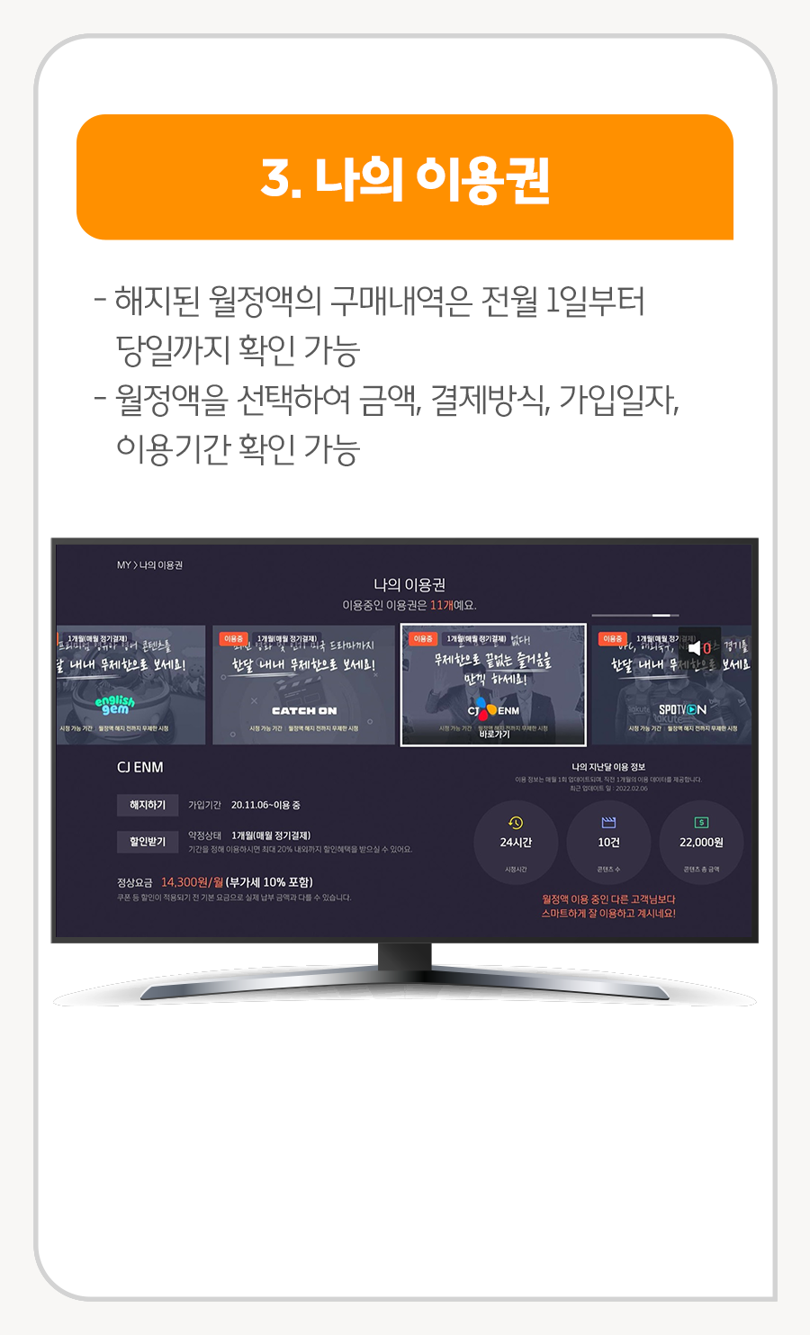 - 월정액을 선택하여 금액, 결제방식, 가입일자, 이용기간 확인 가능