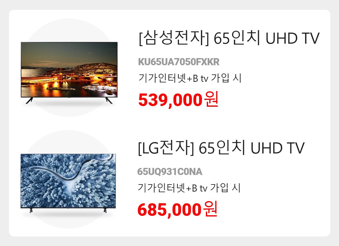 또한 기가인터넷+B tv 가입 시 LG 50인치 UHD TV를 무료 사은품으로 받으실 수 있어요.