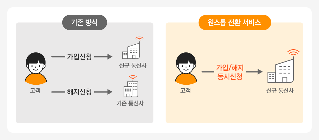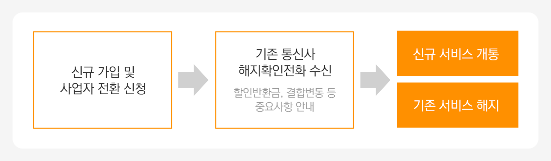신규 통신사와 기존 통신사에 각각 신청하는 대신, 한 번에 간편하게 전환하실 수 있어요.