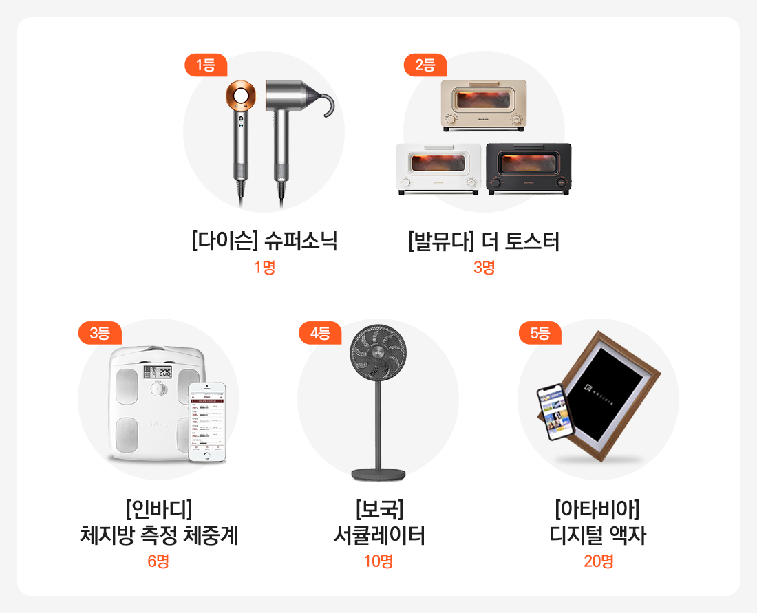 인바디 체지방 측정 체중계 (6명), 보국 서큘레이터 (10명), 아타비아 디지털 액자 (20명)