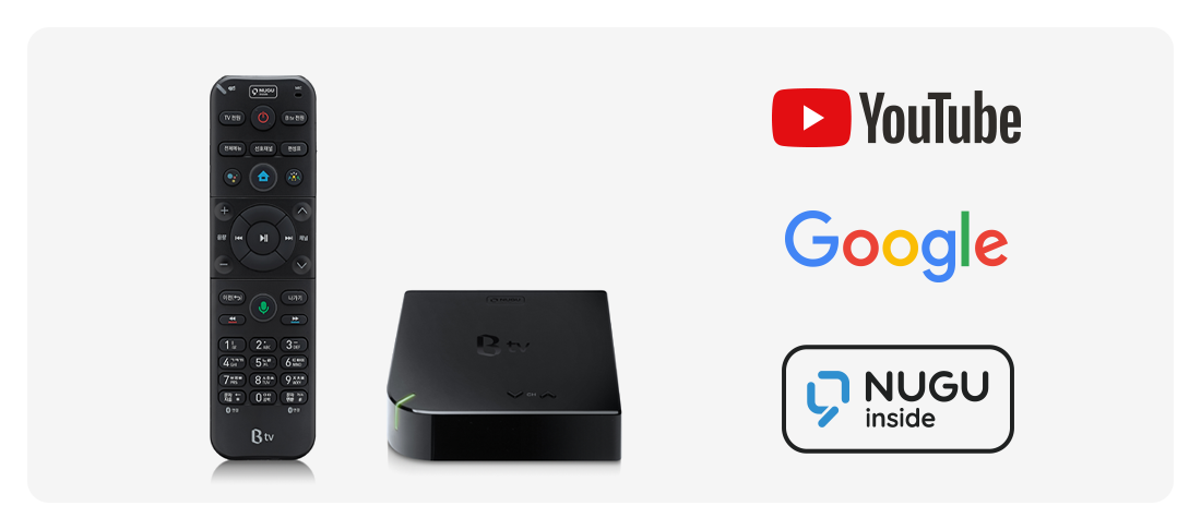 셋, 기존 케이블TV와 달리 유튜브와 다양한 구글TV앱, 인공지능 NUGU도 사용하실 수 있답니다.