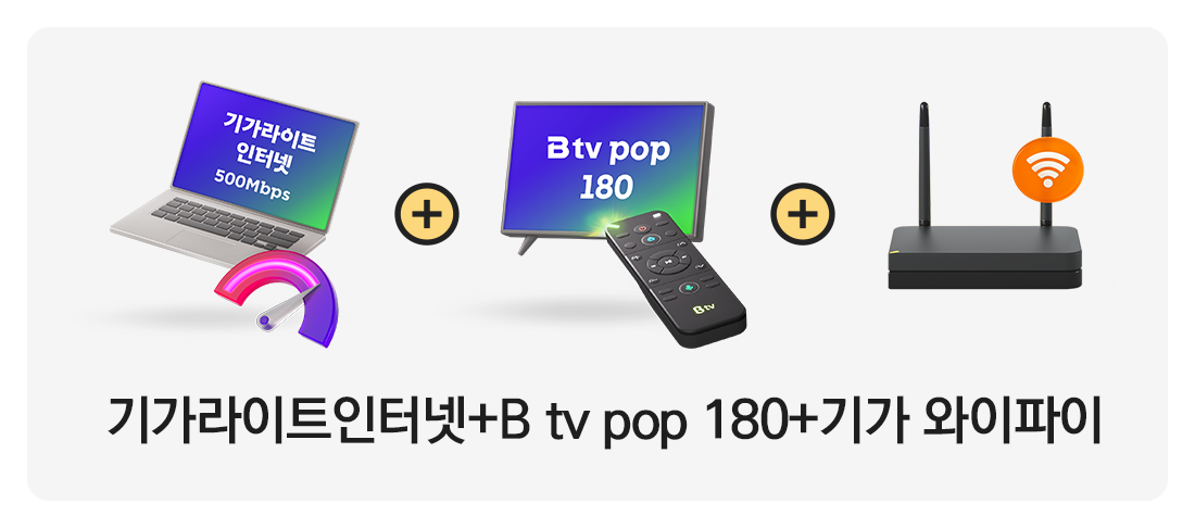 500Mbps 인터넷과 B tv pop 180개 채널, 기가 와이파이를 월 납부금액 8,600원에 사용하세요!
