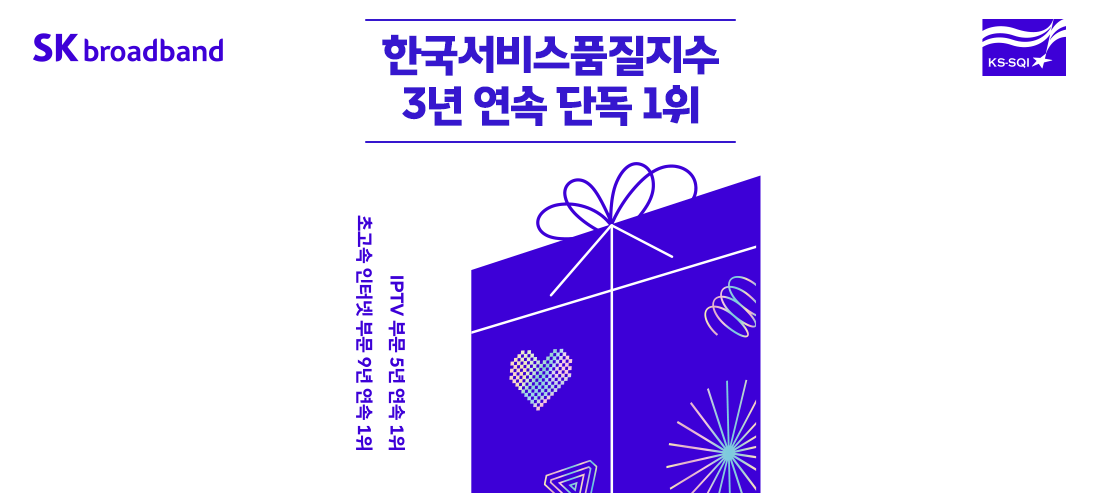 SK브로드밴드가 한국서비스품질지수 초고속인터넷 부문과 IPTV 부문에서 3년 연속 단독 1위를 달성했습니다!