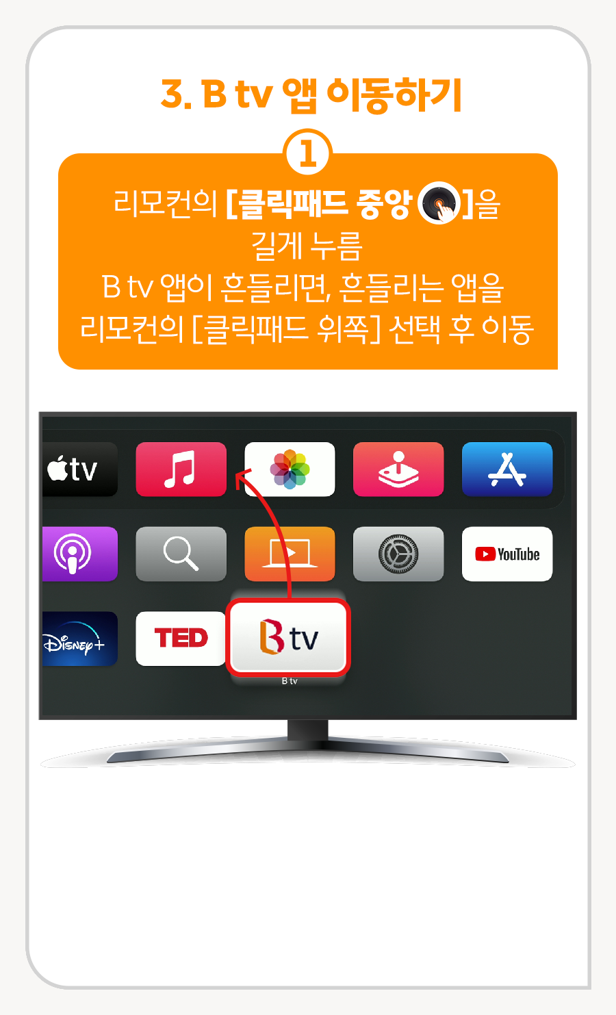 ① 리모컨의 [클릭패드 중앙]을 길게 누름, B tv 앱이 흔들리면, 흔들리는 앱을 리모컨의 [클릭패드 위쪽] 선택 후 이동