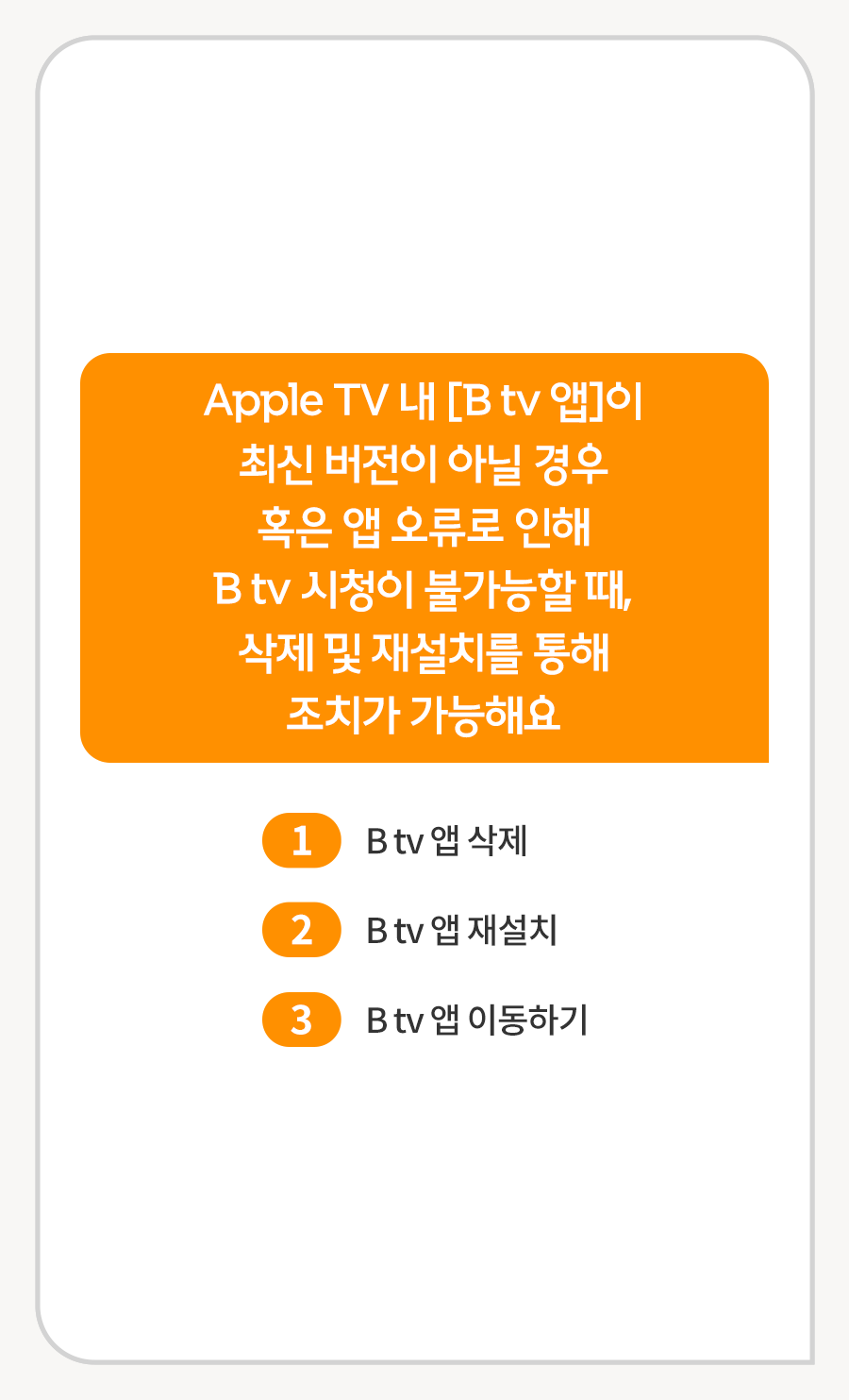 Apple TV 내 [B tv 앱]이 최신 버전이 아닐 경우 혹은 앱 오류로 인해 B tv 시청이 불가능할 때, 삭제 및 재설치를 통해 조치가 가능해요.